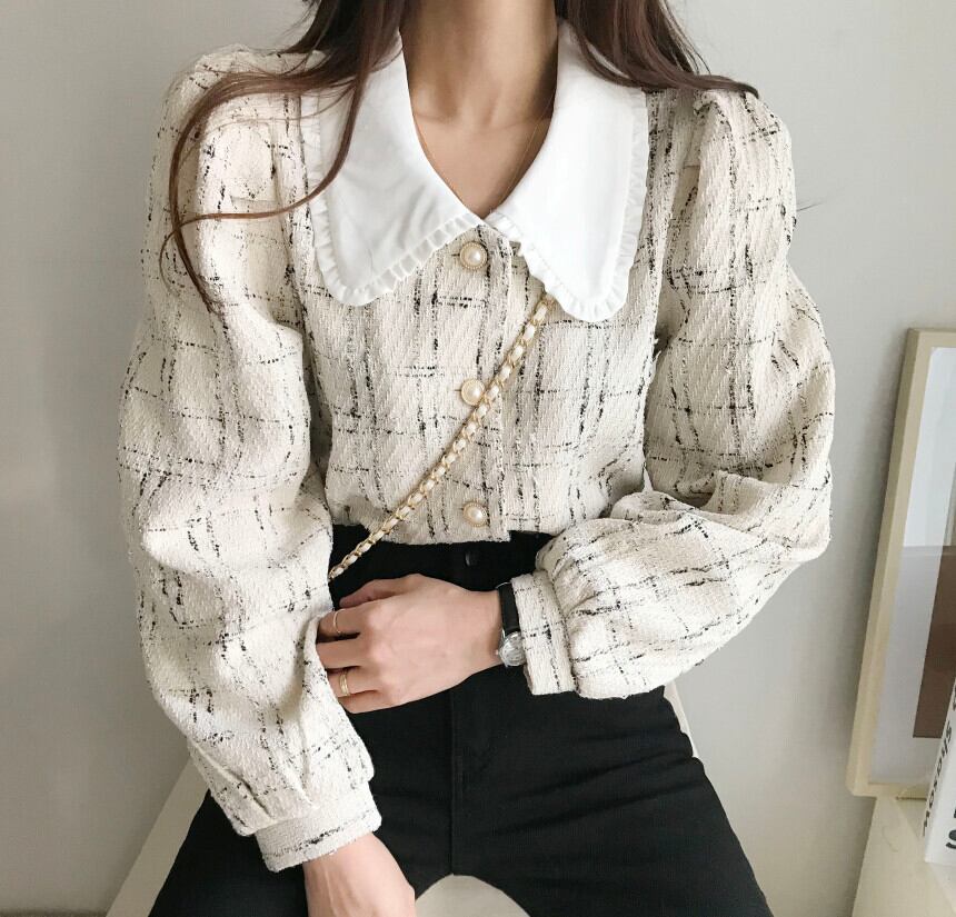 ブラウス トップス レディース パフスリーブ ツイード 丸襟 長袖 ガーリー パール 2色 可愛い かわいい カワイイ デート 韓国 姫 襟 白襟 キラキラ ボタン 白 ホワイト 黒 ブラック ブラウス お嬢様 通勤 通学 お食事会 女子会 アフタヌーンティー お茶会 お洒落 おしゃれ OL 10代 20代 30代 40代 着回し 女っぽ 女の子 大人女子 大人 おとな 大人可愛い 上品 綺麗 きれい キレイ ブラック ホワイト 白 黒 送料無料