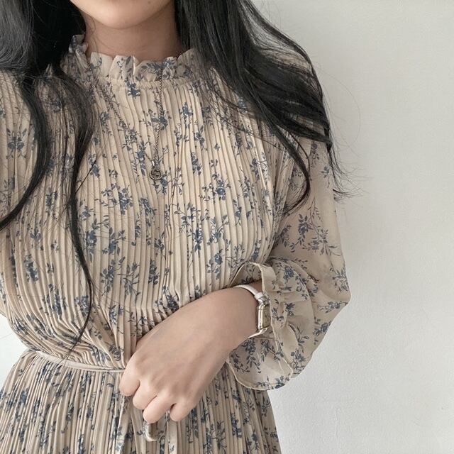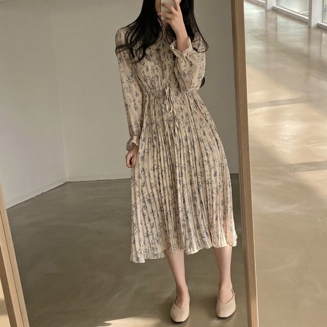 ワンピース レディース プリーツ スカート ハイウエスト 花柄 小花柄 ウエストマーク ミドル丈 ミドル丈ワンピース トランペットスリーブ ボトルネック プリーツ フェミニン エレガンス 送料無料 上品 お嬢様 学生 通学 通勤 韓国 ファッション コーデ コーディネート 春 デート おでかけ おさんぽ 女子会 ママ お呼ばれ 可愛い 綺麗 大人 大人女子 大人可愛い レディー レトロ ヴィンテージデザイン ラグジュアリー 重ね着 10代 20代 30代 リボン プチプラ