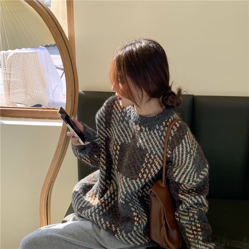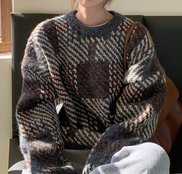 トップス セーター レディース ニット チェック柄 長袖 ラウンドネック ストレート 厚手 かわいい 大人可愛い カジュアル おしゃれ レトロ 大人可愛い 大人女子 ボーイッシュ 送料無料 キュート ガーリー ルーズ エレガント フリーサイズ ゆったり グレー オレンジ 秋 冬 クリスマス バレンタイン 10代 20代 30代 レディース 女性用 通勤 学生 学生 デート お出かけ 女子会 休日 イベント 旅行 着回し お揃い 韓国系 ファッション コーデ スタイル 楽ちん あったか モテ 体型カバー