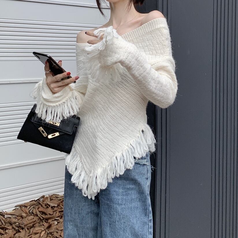 トップス レディース ニット フリンジ タッセル レトロニット 長袖 セーター オフショル Vネック 大人可愛い 大人女子 大人 セクシー 変形 きれいめ 上品 送料無料 フォーマル ガーリー フェミニン マニッシュ ルーズ キュート 春 秋 冬 二次会 お呼ばれ オフィス 通勤 通学 OL デート お出かけ おさんぽ パーティー イベント 女子会 体型カバー ゆったり インスタ映え 白 ホワイト 10代 20代 30代 40代 フリーサイズ ワンサイズ プチプラ