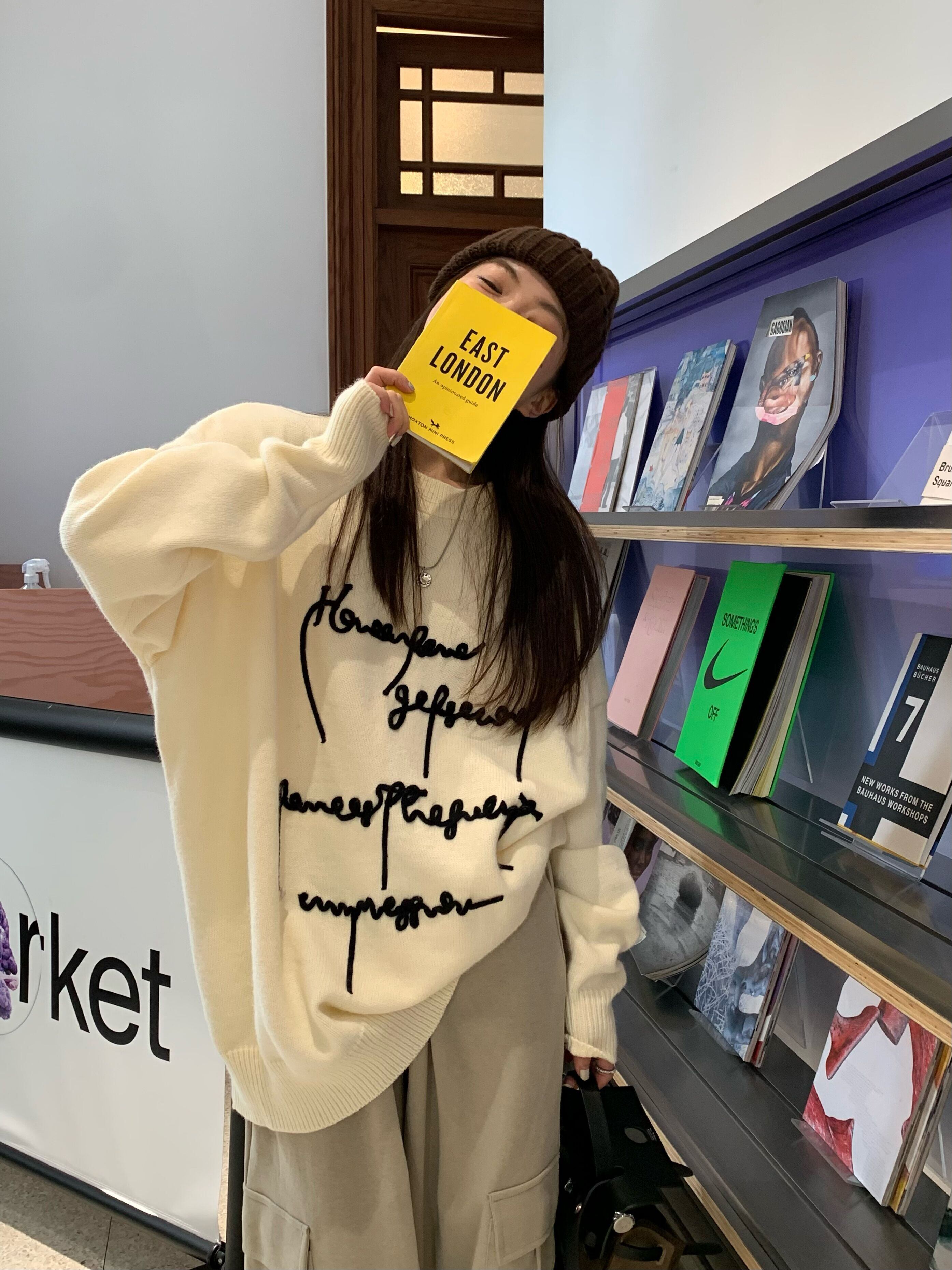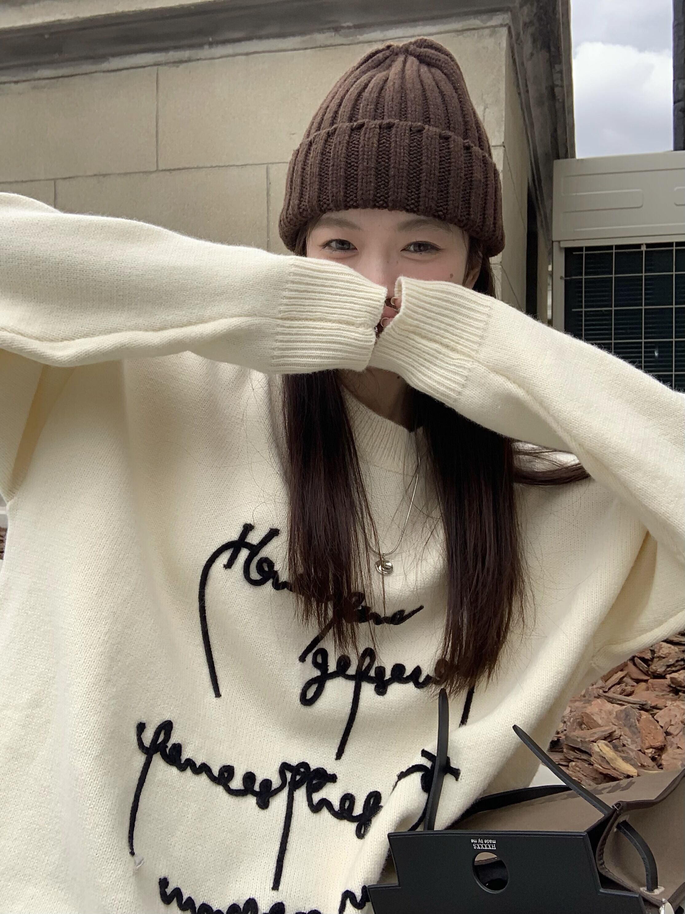 おしゃれな英字刺繡デザインのバイカラーニット。