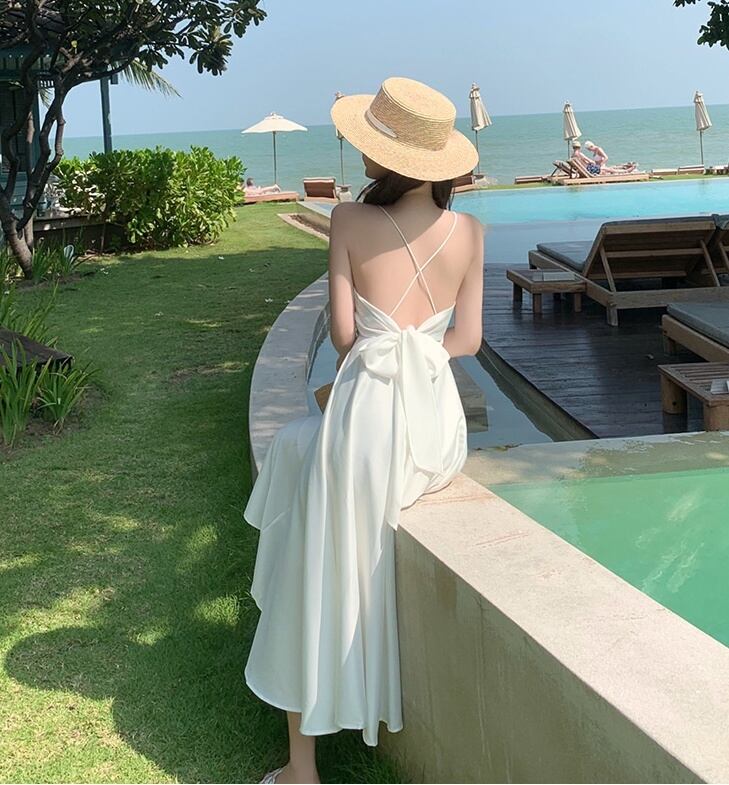 大胆に大きく開いた背中にバックリボンがとっても可愛いサマードレスです。