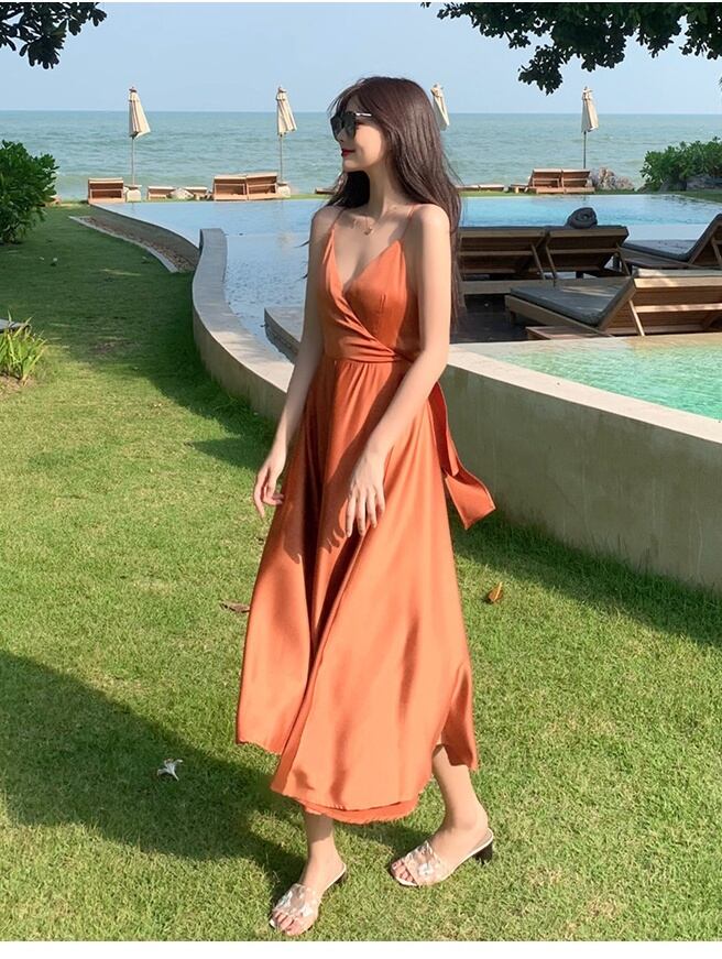 ワンピース レディース ロングワンピース 2カラー S M L XL ホワイト キャラメル カラバリ ロング丈 ノースリーブ キャミワンピース Ⅴネック クロスバック バックリボン バックコンシャス 光沢 サテン調 背中見せ サマードレス 無地 フレア ハイウエスト スタイルアップ 脚長効果 シンプル カジュアル フェミニン セクシー 大人可愛い おしゃれ 普段使い イベント デート お出かけ 女子会 休日 旅行 リゾート ビーチ 着まわし ファッション コーデ スタイル モテ 送料無料 こなれ感 春 夏