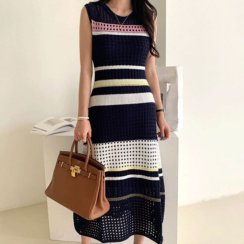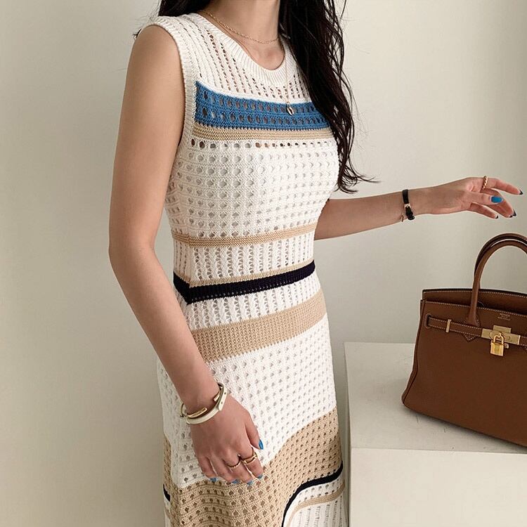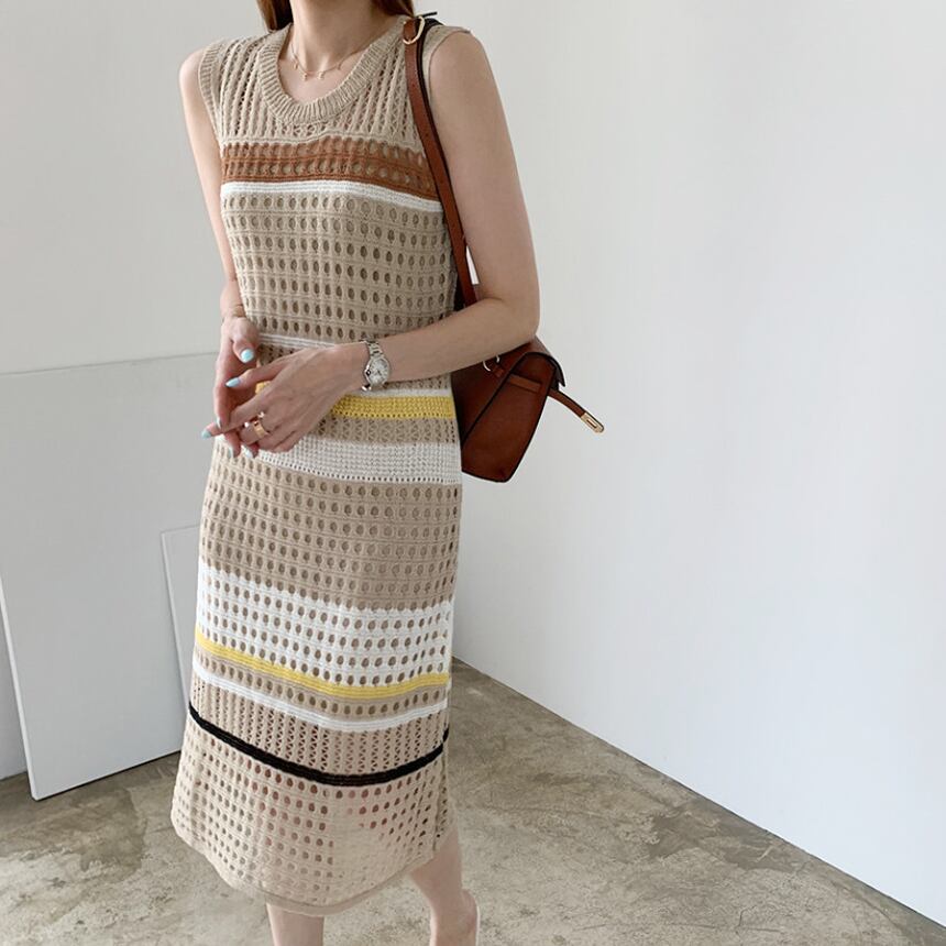 3色 ワンピース レディース ロングワンピース 3カラー フリーサイズ ホワイト ブラック カーキ カラバリ 2点セット インナー付き ロング丈 ノースリーブ ニットワンピース サマードレス サマーニット ボーダー ストライプ マルチカラー 透け感 ローゲージ スタイルアップ 体型カバー シンプル カジュアル フェミニン 大人可愛い おしゃれ 普段使い イベント デート お出かけ 女子会 休日 旅行 リゾート ビーチ 着まわし ファッション コーデ スタイル モテ 送料無料 こなれ感 涼しい 春 夏