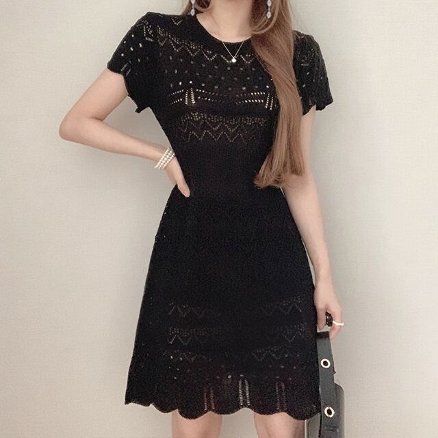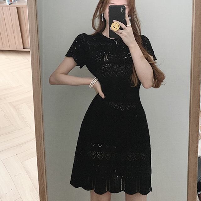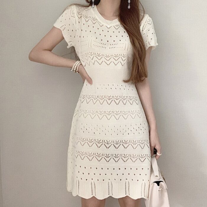ワンピース レディース ニットワンピース 2カラー フリーサイズ ホワイト ブラック カラバリ ミニ丈 半袖 柄 ニット セーター 透かし編み サマードレス サマーニット 透け感 スカラップ クルーネック ハイウエスト スタイルアップ 脚長効果 シンプル カジュアル フェミニン ガーリー キュート 大人可愛い おしゃれ 普段使い イベント デート お出かけ 女子会 休日 旅行 リゾート 着まわし ファッション コーデ スタイル モテ 送料無料 抜け感 涼しげ 春 夏