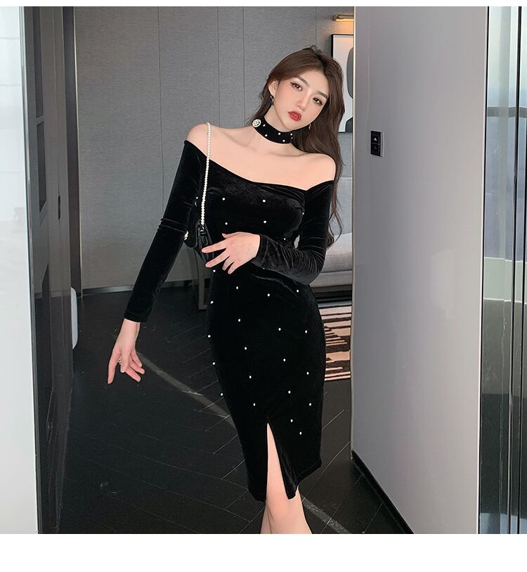 ドレス レディース タイトドレス 2カラー S M L ワインレッド ブラック カラバリ 長袖 ワンピース パール装飾 ベルベット調 光沢 チョーカー風 デコルテ オフショルダー 膝上丈 スリット Tストラップバック タイト ボディコンシャス 華やか ハイウエスト スタイルアップ シンプル フェミニン エレガント セクシー 大人可愛い おしゃれ イベント デート お出かけ 休日 パーティー お呼ばれ 二次会 ファッション コーデ モテ 存在感 送料無料 ユニーク 秋 冬