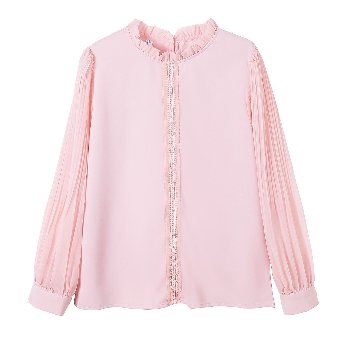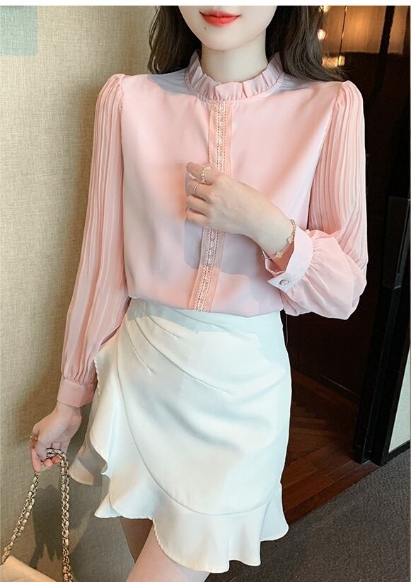 トップス レディース ブラウス S M L XL 2XL ピンク シャツ 長袖 シフォン フリル スタンドネック 襟付き パフスリーブ 袖コンシャス レース パール カフス 上品 無地 シンプル きれいめ カジュアル フェミニン キュート 華やか 大人可愛い おしゃれ 普段使い デート お出かけ 女子会 休日 旅行 お呼ばれ セレモニー 通勤 通学 着まわし ファッション コーデ スタイル モテ 送料無料 こなれ感 春 秋