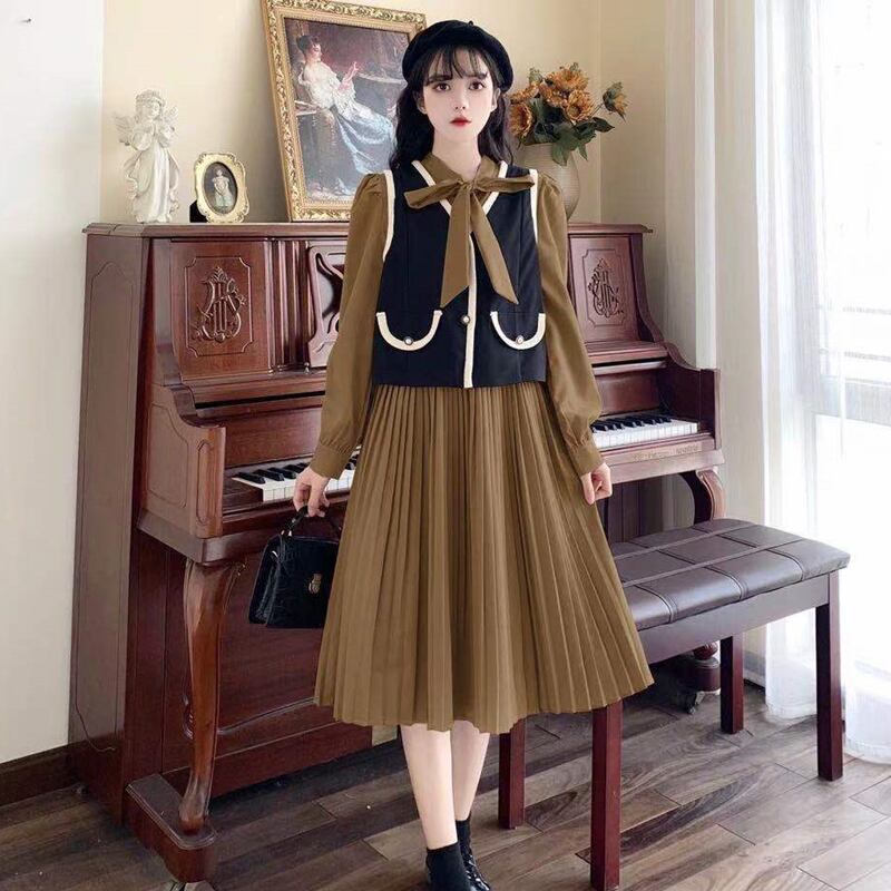 セットアップ レディース ワンピース ジレ 2カラー M L XL 2XL 3XL 4XL ブラック カーキ カラバリ 2点セット ロングワンピース 長袖 無地 プリーツワンピース パフスリーブ リボン タイ バイカラー パイピング ベスト パール レトロ クラシカル ハイウエスト スタイルアップ 脚長効果 体型カバー シンプル カジュアル フェミニン ガーリー 上品 大人可愛い おしゃれ 普段使い イベント デート お出かけ 休日 旅行 お呼ばれ 重ね着コーデ ファッション 送料無料 春 秋 冬