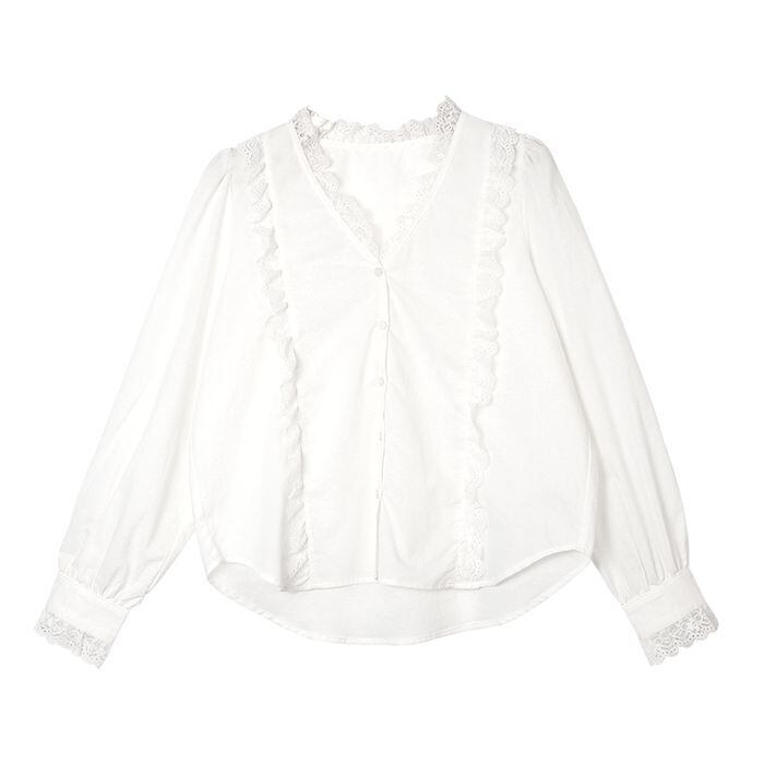 トップス レディース ブラウス 長袖 Vネック レース かわいい 大人可愛い きれいめ 大人 上品 おしゃれ お洒落 大人女子 キュート セクシー 主役級 存在感 フェミニン 春 秋 10代 20代 30代 40代 オフィス ビジネス OL 通勤 学生 通学 デート お出かけ 女子会 着回し 普段使い 重ね着 韓国 韓国系 送料無料 ファッション コーデ スタイル 体型カバー トレンド 流行 ゆったり ゆる 白 ホワイト