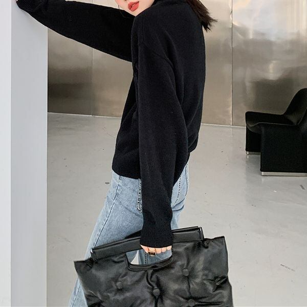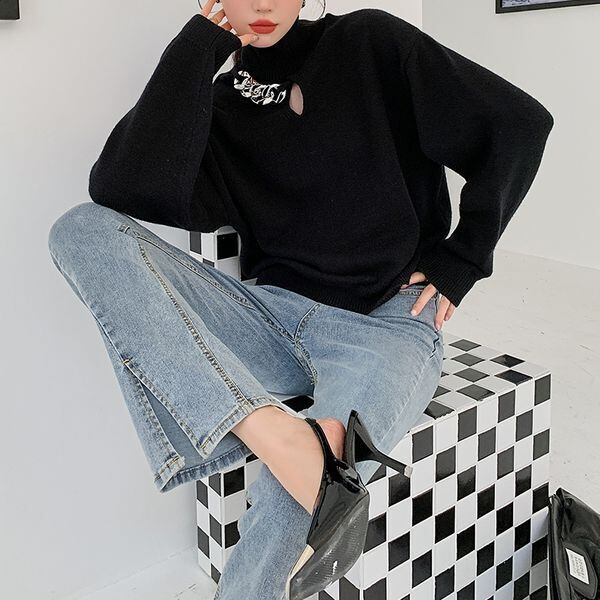 トップス レディース セーター アシンメトリー チェーン S M L ブラック リブ 伸縮性 ニット ハイネック タートルネック 長袖 ニットソー プルオーバー シンプル カジュアル フェミニン キュート 大人可愛い おしゃれ 普段使い デート お出かけ 女子会 休日 旅行 通勤 通学 着まわし 重ね着コーデ ファッション コーデ スタイル モテ 送料無料 抜け感 ユニーク 秋 冬