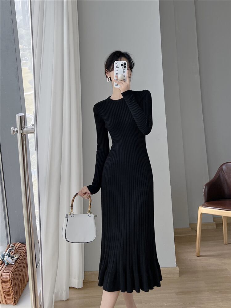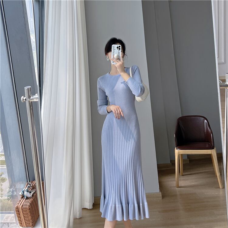 ワンピース レディース ニットワンピース リブニット フリル プルオーバー 膝丈 ひざ丈 膝下 ミモレ丈 長袖 かわいい 大人可愛い シンプル きれいめ 大人 おしゃれ お洒落 ラブリー キュート ガーリー 主役級 存在感 無地 秋 冬 お呼ばれ 20代 30代 40代 OL 通勤 学生 通学 デート お出かけ 女子会 休日 着回し 普段使い 韓国 韓国系 送料無料 ファッション コーデ スタイル モテ トレンド 流行 インスタ映え S M L ブラック ホワイト ブルー ピンク