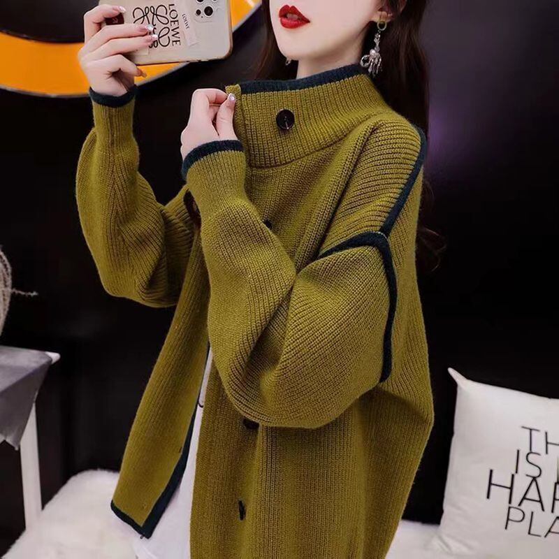 トップス レディース ニット セーター カーディガン 長袖 ハイネック バイカラー 配色 かわいい 大人可愛い きれいめ シンプル カジュアル 大人 上品 おしゃれ お洒落 こなれ感 キュート 主役級 存在感 抜け感 無地 秋 冬 10代 20代 30代 40代 OL 通勤 学生 通学 デート お出かけ 女子会 休日 着回し 普段使い 韓国 韓国系 送料無料 ファッション コーデ スタイル モテ 体型カバー トレンド 流行 S M L XL 2XL グリーン ベージュ ブラック