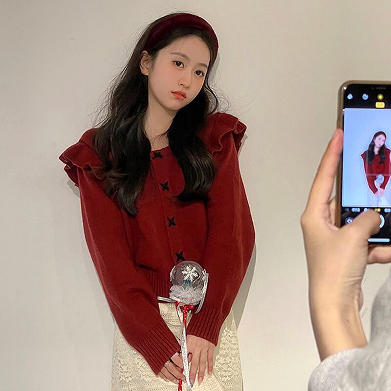 トップス レディース カーディガン プルオーバー セーター ショート丈 長袖 ラウンドネック フレア ボタン ニット かわいい 大人可愛い シンプル カジュアル おしゃれ レトロ こなれ感 ラフ ラブリー キュート ガーリー ルーズ 送料無料 存在感 S M L レッド ブルー ベージュ 無地 秋 冬 10代 20代 30代 OL 通勤 学生 通学 デート お出かけ 女子会 着回し 普段使い 重ね着 双子 韓国系 ファッション コーデ スタイル 楽ちん あったか モテ トレンド 流行 インスタ映え