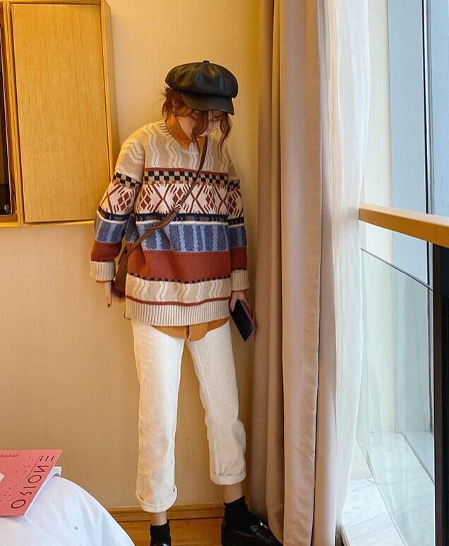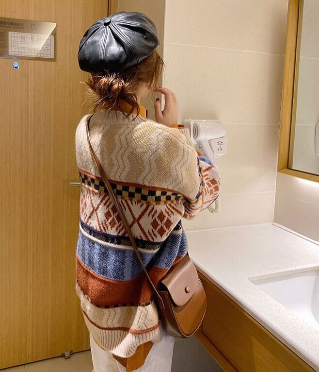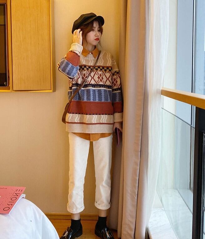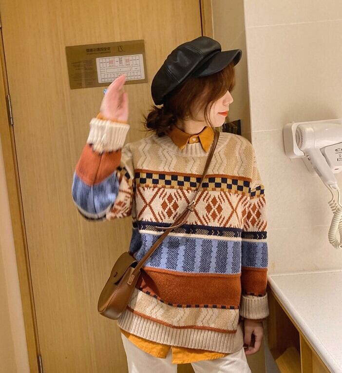トップス レディース ニット セーター プルオーバー 長袖 ラウンドネック かわいい 大人可愛い カジュアル おしゃれ お洒落 かっこいい レトロ こなれ感 ラフ スポーティー キュート 送料無料 存在感 個性的 幾何 柄 秋 冬 10代 20代 30代 40代 学生 通学 デート お出かけ 女子会 休日 着回し 普段使い 重ね着 韓国 韓国系 ファッション コーデ スタイル モテ トレンド 流行 インスタ映え ゆったり ゆる S M L XL 2XL ゆったり ゆる