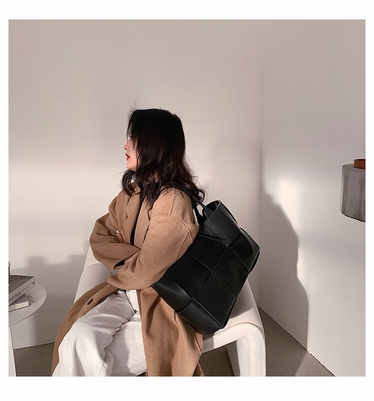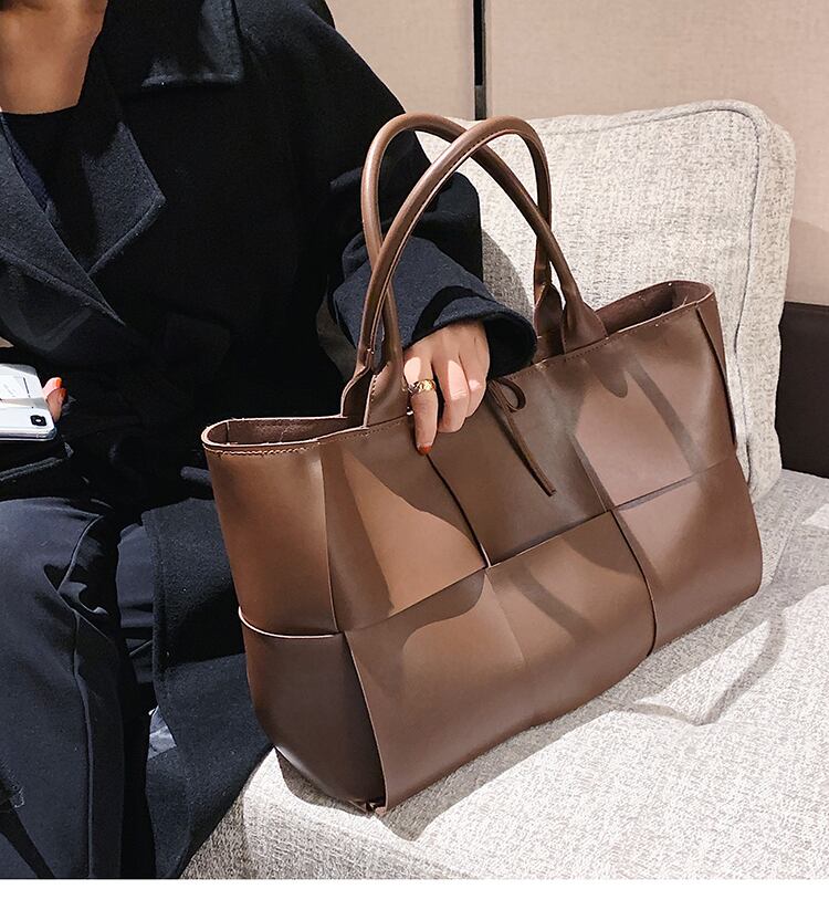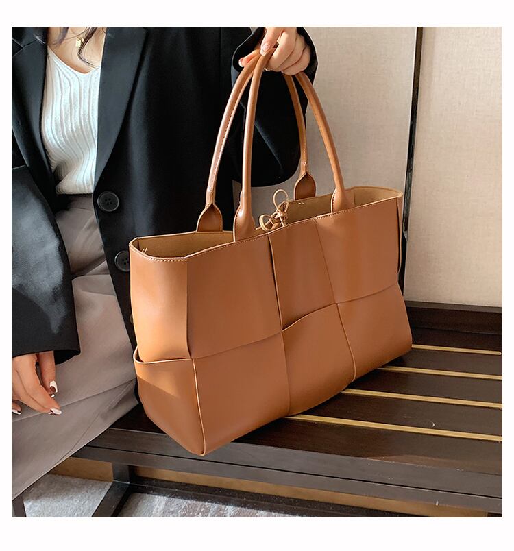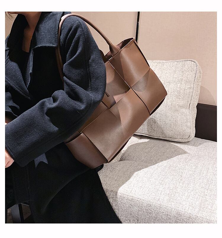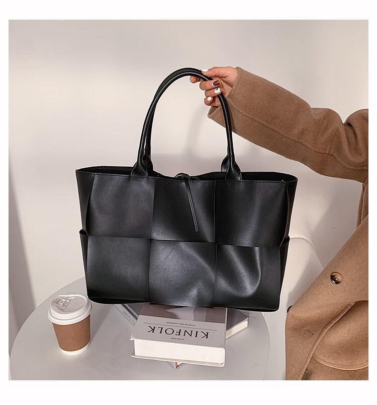 PUレザーをざっくり編み込んだデザインがオシャレな大人のトートバッグです。