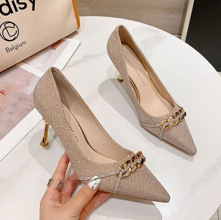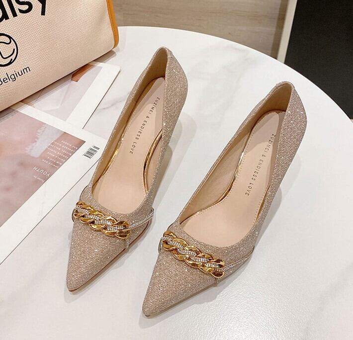 美しい光沢とチェーン装飾がエレガントなパンプスです^^