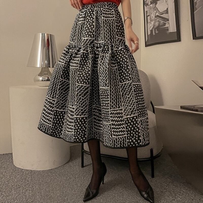 スカート レディース フレアスカート ミドル丈 Aライン ハイウエスト ウエストゴム 薄手 かわいい 大人可愛い きれいめ シンプル カジュアル 大人 上品 おしゃれ レトロ かっこいい 大人女子 こなれ感 ラフ キュート ガーリー 個性的 エレガント 送料無料 フリーサイズ ゆったり ホワイト ブラック 立体プリント 春 夏 秋 10代 20代 30代 40代 OL 通勤 学生 通学 デート お出かけ 女子会 着回し 普段使い 双子 韓国系 ファッション コーデ スタイル 楽ちん モテ 体型カバー