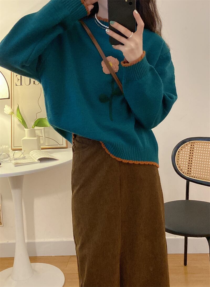 トップス レディース ニット セーター プルオーバー 長袖 ラウンドネック 花刺繍 花 刺繍 かわいい 大人可愛い きれいめ カジュアル 大人 上品 おしゃれ お洒落 こなれ感 ラフ エレガント 送料無料 無地 秋 冬 10代 20代 30代 40代 50代 OL 通勤 学生 通学 デート お出かけ 女子会 着回し 普段使い 韓国 韓国系 ファッション コーデ スタイル 防寒 モテ トレンド 流行 インスタ映え ワンサイズ フリーサイズ ホワイト グリーン