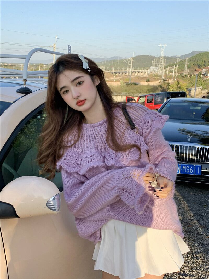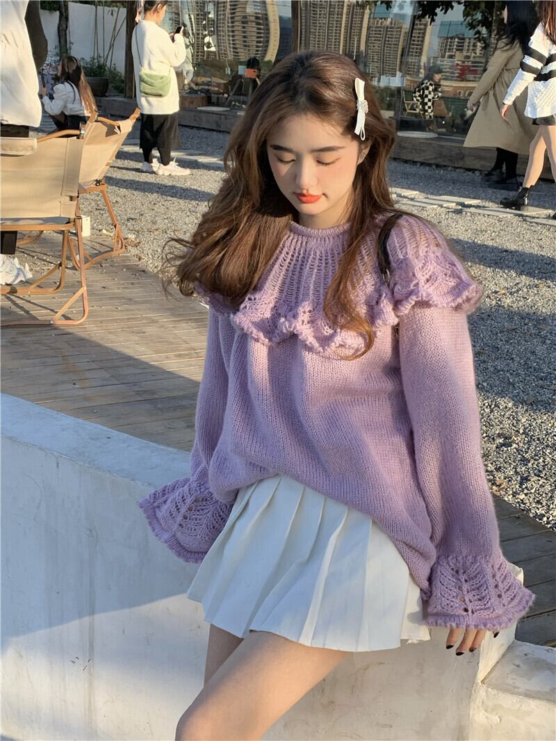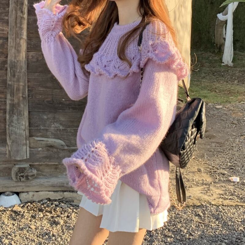 トップス レディース セーター S M L パープル ニット ローゲージ 長袖 無地 プルオーバー ベルスリーブ フリル 手編み風 ざっくり 透け感 オーバーサイズ ゆったり ルーズ 体型カバー 二の腕カバー 小顔効果 シンプル カジュアル フェミニン キュート ガーリー 大人可愛い おしゃれ 普段使い デート お出かけ 女子会 休日 旅行 通学 着まわし 重ね着コーデ ファッション コーデ スタイル モテ 送料無料 こなれ感 ユニーク 春 秋 冬 個性的 かわいい キュート だぼっと 萌え袖 かぎ針編み