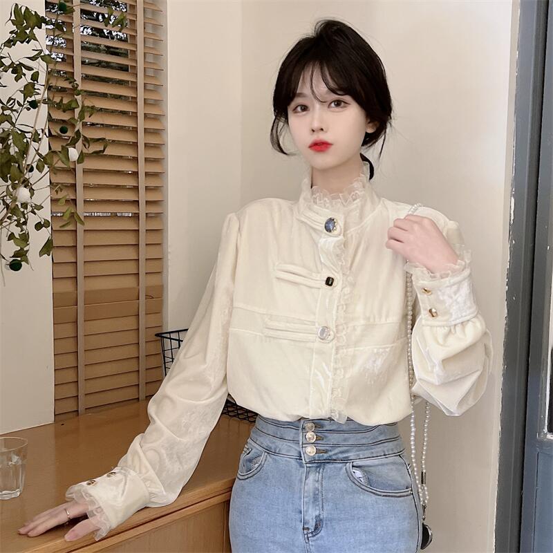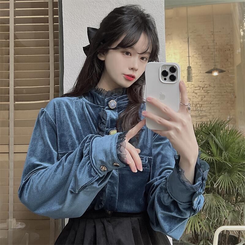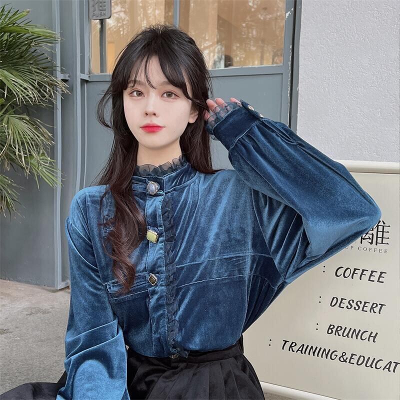 トップス レディース ブラウス 2カラー S M L オフホワイト ブルー カラバリ シャツ スタンドネック 長袖 無地 ベルベット調 クラシカル ストーン風ボタン フリル レース 華やか パフスリーブ ヴィンテージライク ゆったり ルーズ 体型カバー シンプル カジュアル フェミニン エレガント 大人可愛い おしゃれ 普段使い デート お出かけ 女子会 休日 旅行 お呼ばれ 着まわし 重ね着コーデ 送料無料 こなれ感 ユニーク 韓国系 ファッション コーデ スタイル モテ 春 秋 冬