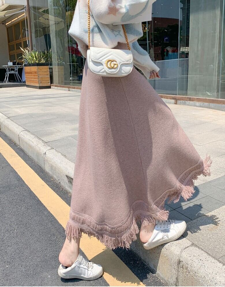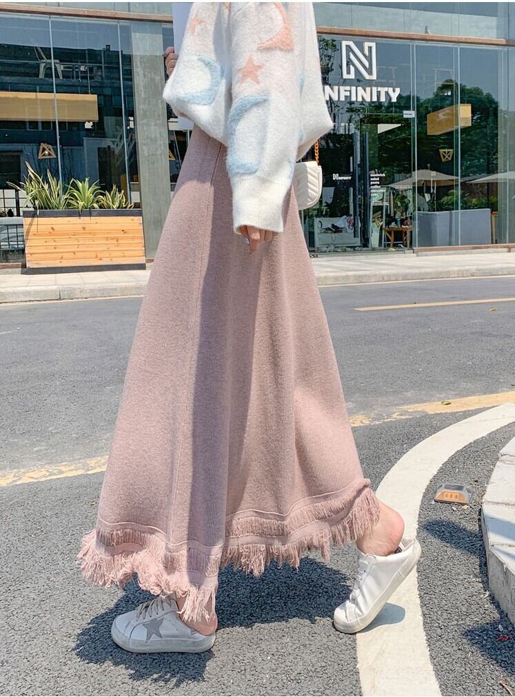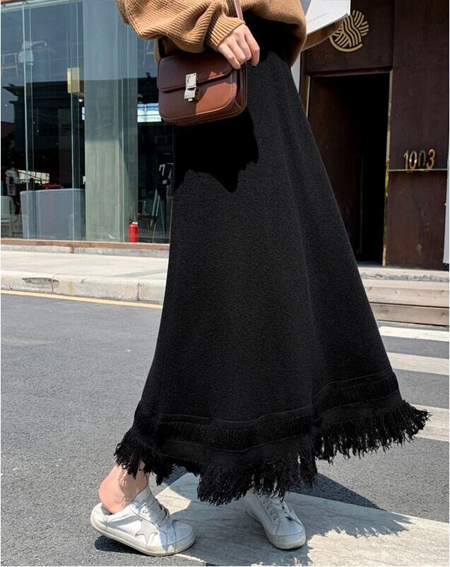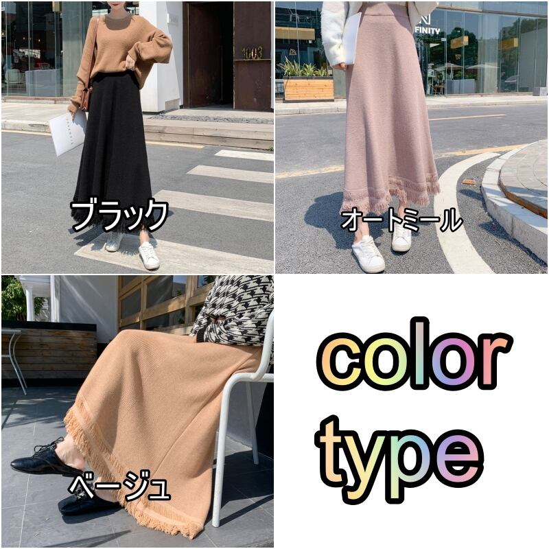 スカート レディース フレアスカート ロング丈 Aライン ハイウエスト 伸縮性 ニット フリンジ かわいい 大人可愛い きれいめ シンプル カジュアル 大人 上品 おしゃれ かっこいい キュート ガーリー 個性的 送料無料 S M L XL 2XL ゆったり ブラック オートミール ベージュ 無地 春 秋 冬 10代 20代 30代 40代 ママ 通勤 学生 通学 デート お出かけ 女子会 着回し 普段使い 韓国系 ファッション コーデ スタイル 楽ちん モテ 体型カバー トレンド 脚長 流行 インスタ