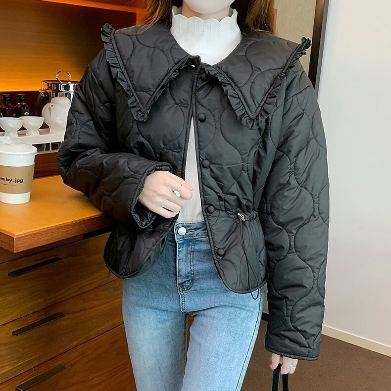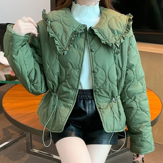 アウター レディース ジャケット キルティングジャケット ショート丈 長袖 襟付き フリル ウエスト調節可能 シングルブレスト 大人可愛い きれいめ シンプル カジュアル 上品 お洒落 大人女子 こなれ感 ラフ キュート ガーリー ルーズ クール モード系 送料無料 抜け感 温かい 無地 秋 冬 10代 20代 30代 40代 デート お出かけ 女子会 お泊まり 休日 パーティー 着回し 普段使い 重ね着 お揃い 双子 韓国 ファッション スタイル 楽ちん S M L XL ブラック ホワイト グリーン