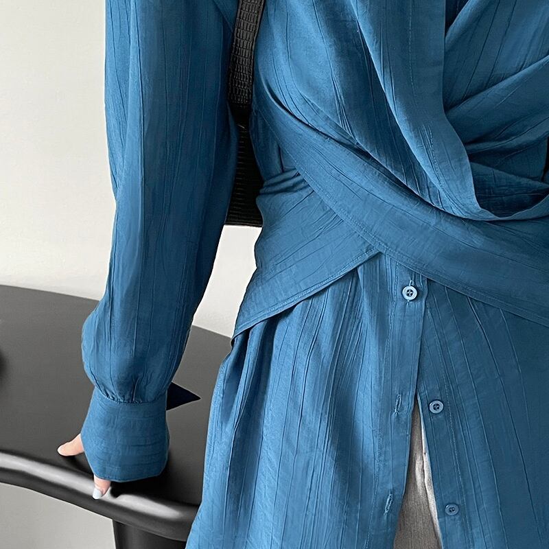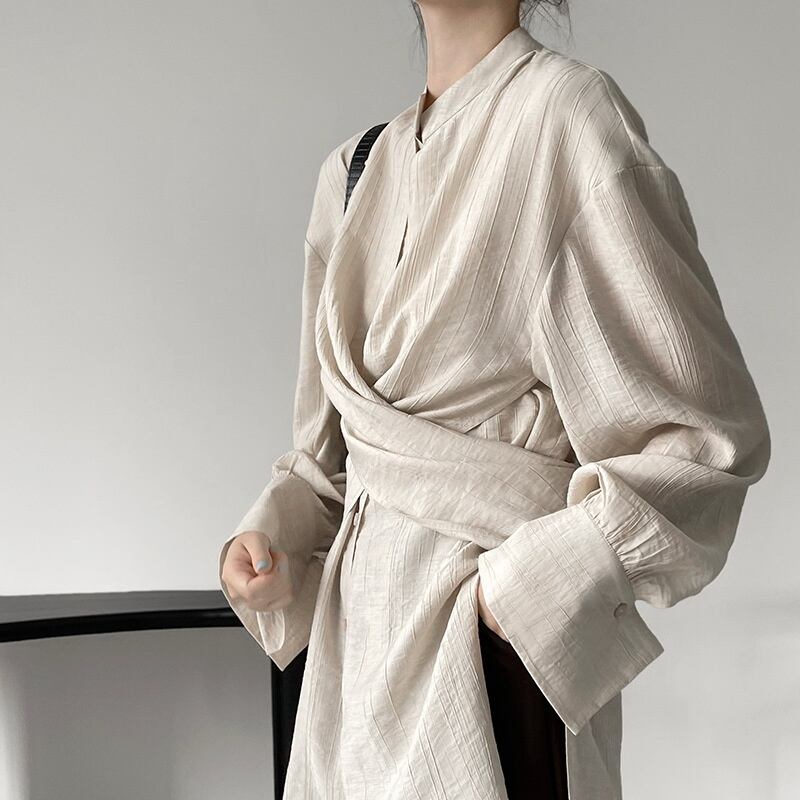 フロント部分がクロスになっていてキレイ見えと楽ちんさを両立させたシャツ♪