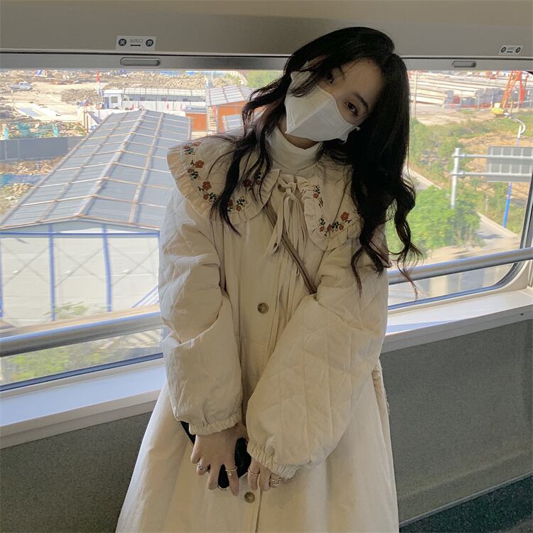 襟元のフリルと花柄刺繡がかわいいロングコート。