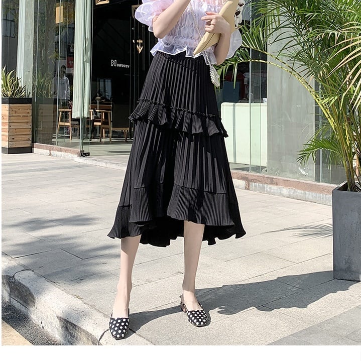 プリーツとフリルが可愛いティアードスカート。