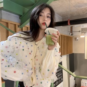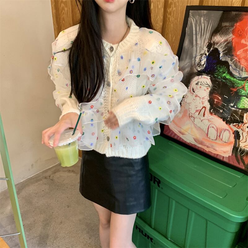 トップス レディース セーター フリーサイズ ホワイト マルチカラー 長袖 花柄刺繍 小花柄 フラワー柄 フリル チュール ざっくり感 ローゲージニット 異素材 ドッキング クルーネック シングルブレスト 羽織り カーディガン 華やか カジュアル フェミニン ラブリー キュート ガーリー 大人可愛い おしゃれ 普段使い デート お出かけ 女子会 休日 旅行 通学 学生 通勤 OL ファッション コーデ スタイル モテ 異素材MIX 存在感 送料無料 ユニーク 韓国系 春 秋 冬