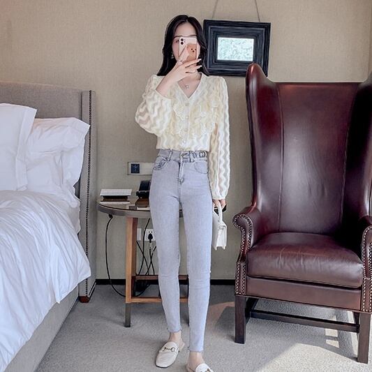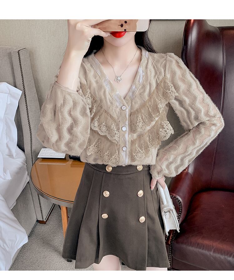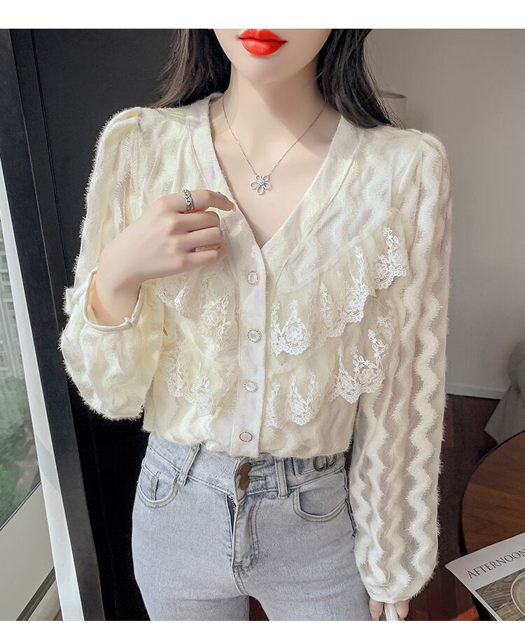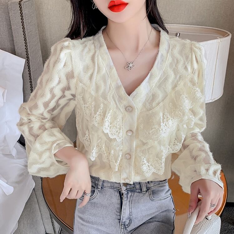 トップス レディース ブラウス シャツ 2カラー S M L XL アプリコット モカ カラバリ カーディガン 羽織り Vネック 長袖 パフスリーブ レース フリル 起毛 シアー 透け感 華奢見え シンプル きれいめ カジュアル フェミニン キュート 大人可愛い おしゃれ 普段使い デート お出かけ 女子会 休日 旅行 通勤 通学 着まわし 存在感 送料無料 ユニーク 韓国系 ファッション コーデ スタイル モテ サイズ展開豊富 プラスサイズ 春 秋 冬 かわいい デザイン ストライプ 縞 きれいめ