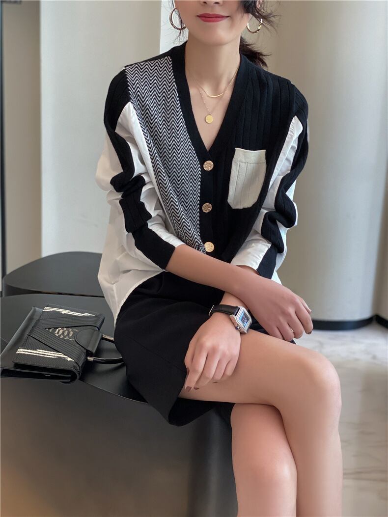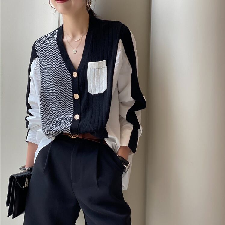トップス レディース カーディガン 2カラー S M L ブラック ブルー カラバリ 異素材 ドッキング 羽織り ニット シャツ Vネック 長袖 アシンメトリー 前開き ボタン ヘリンボーン 華奢見え シンプル きれいめ カジュアル メンズライク 個性的 大人可愛い おしゃれ 普段使い デート お出かけ 女子会 休日 旅行 通勤 通学 着まわし 存在感 送料無料 ユニーク 韓国系 ファッション コーデ スタイル モテ 春 秋 冬 10代 20代 30代 40代
