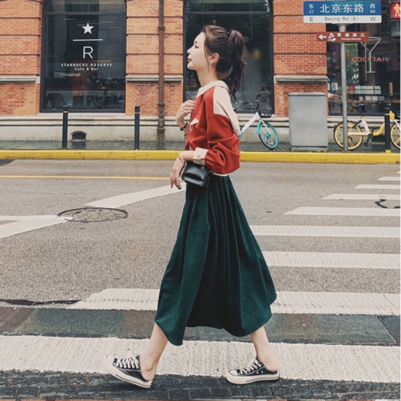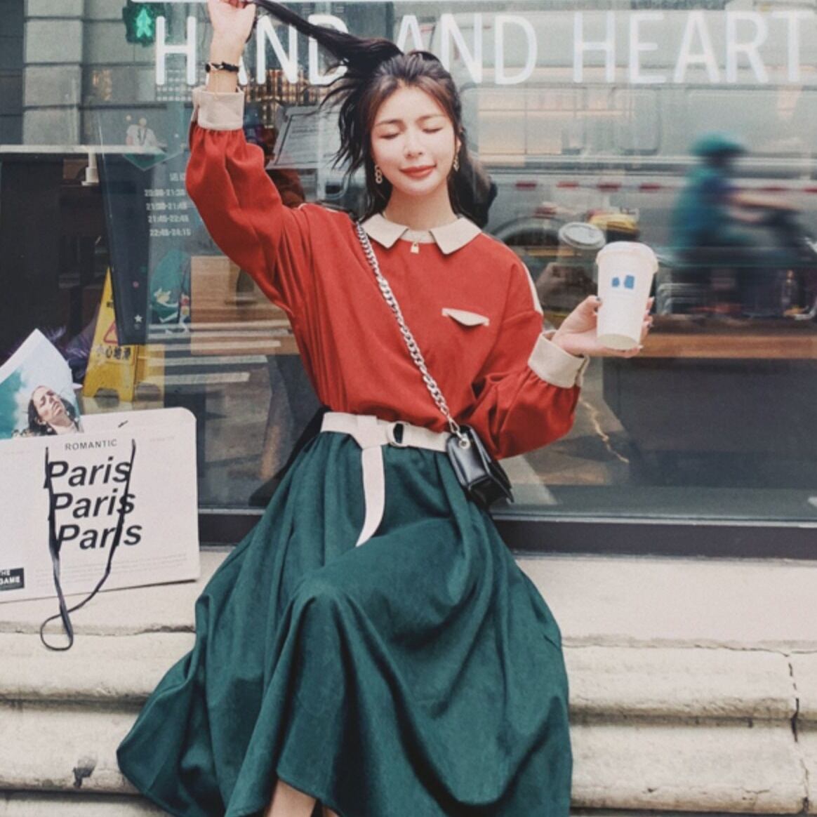ワンピース レディース 2カラー フレアワンピース ミモレ丈 ロング 袖あり 長袖 ボリューム袖 ロングカフス 襟付き クルーネック フレア Aライン ドッキング ウエストマーク ベルト かわいい シンプル カジュアル おしゃれ お洒落 アジアン 大人可愛い ラフ スポーティー レトロ 無地 学生 デート お出かけ 女子会 休日 アウトドア 送料無料 公園 S M L XL レッド グリーン 春 秋 冬 10代 20代 韓国 楽ちん ファッション コーデ スタイル