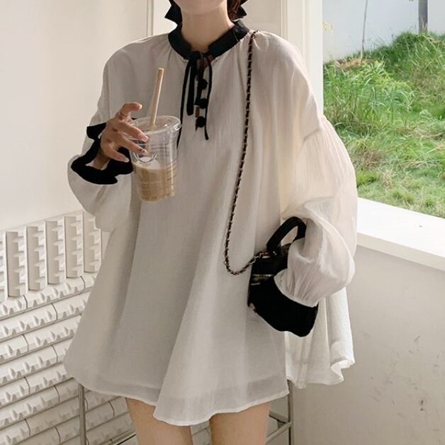 トップス レディース シャツ ブラウス 長袖 ボリューム袖 スタンドカラー フリル 透け感 かわいい 大人可愛い きれいめ シンプル カジュアル 大人 上品 おしゃれ レトロ 大人女子 ラフ ガーリー キュート 送料無料 ルーズ 個性的 セクシー エレガント とろみ感 フリーサイズ ゆったり ホワイト 無地 春 夏 10代 20代 30代 ママ 通勤 学生 通学 デート お出かけ 女子会 着回し 普段使い 韓国系 ファッション コーデ スタイル 楽ちん モテ 体型カバー トレンド 流行 インスタ映え