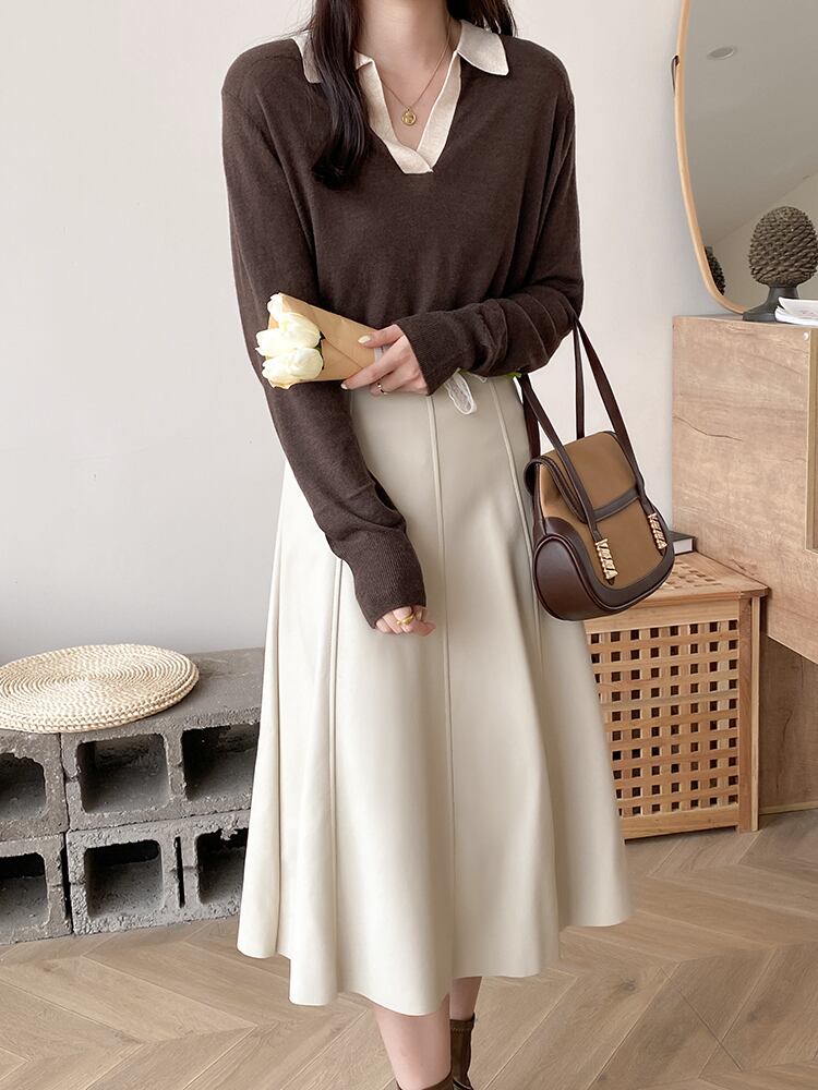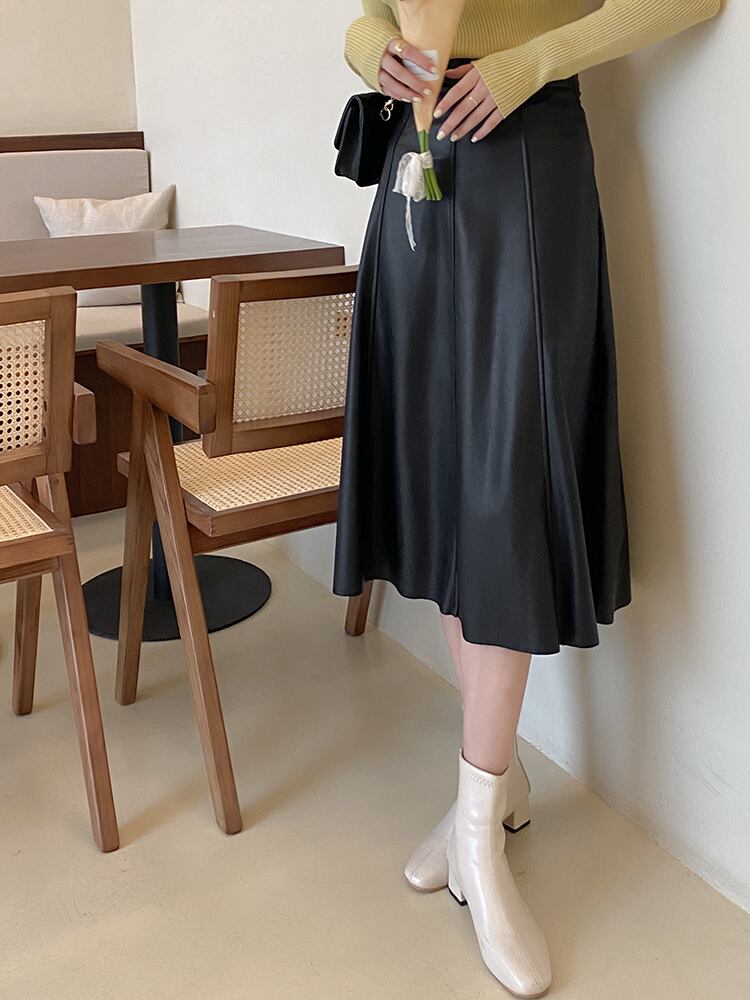 クールで美しい、フェイクレザー仕立てのフレアスカート。
