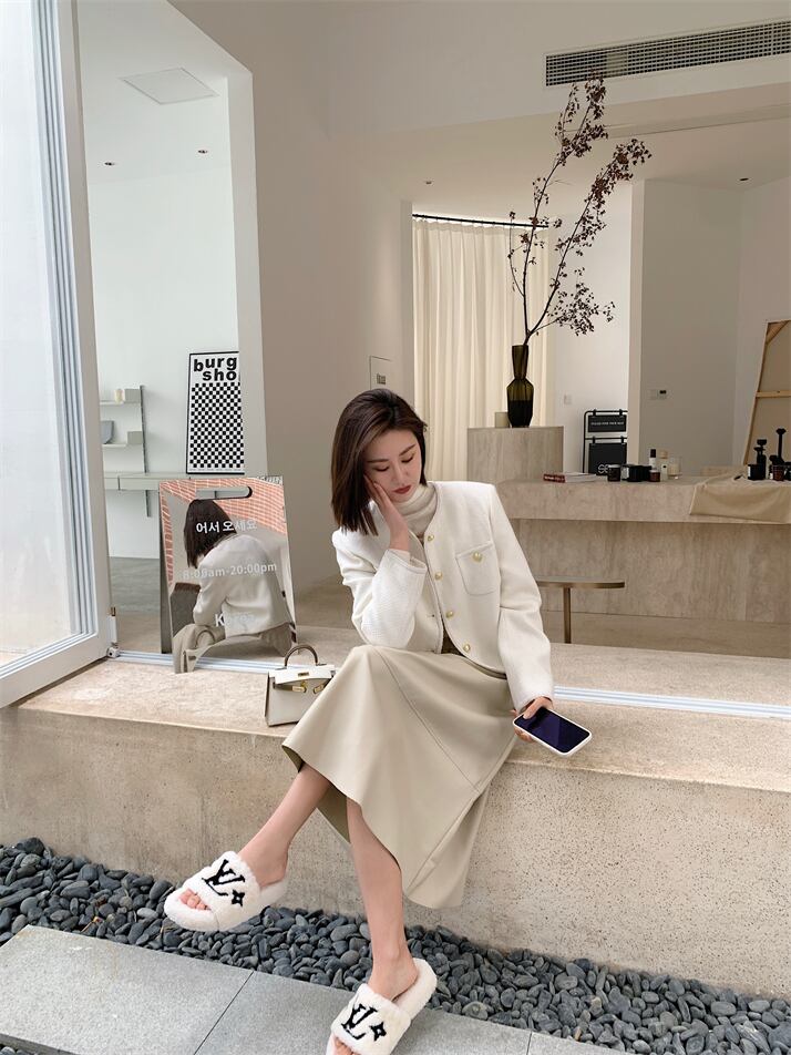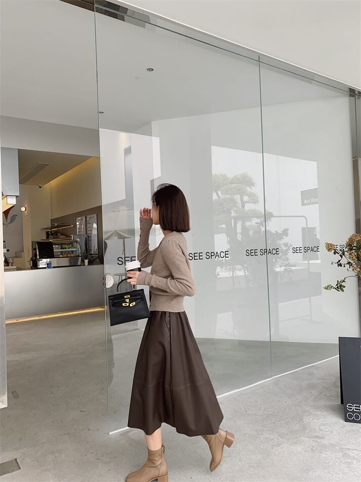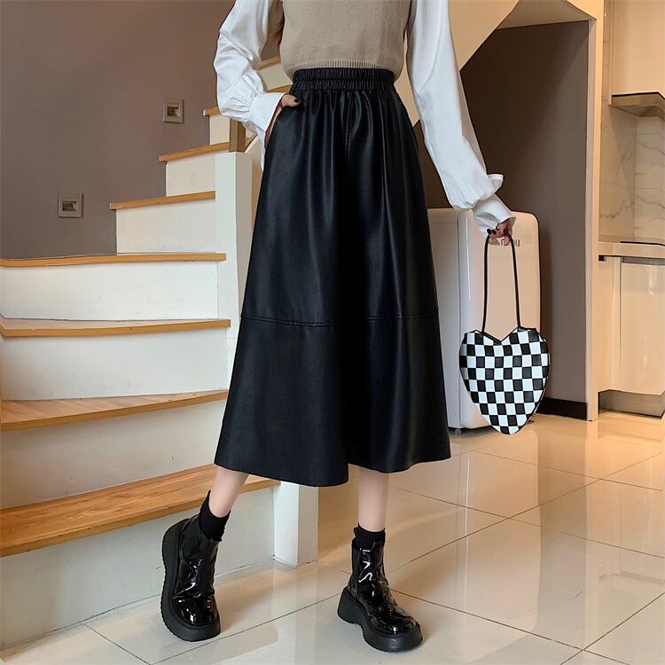 旬のフェイクレザーでワンランク上のスタイリングが楽しめるミモレ丈スカート。