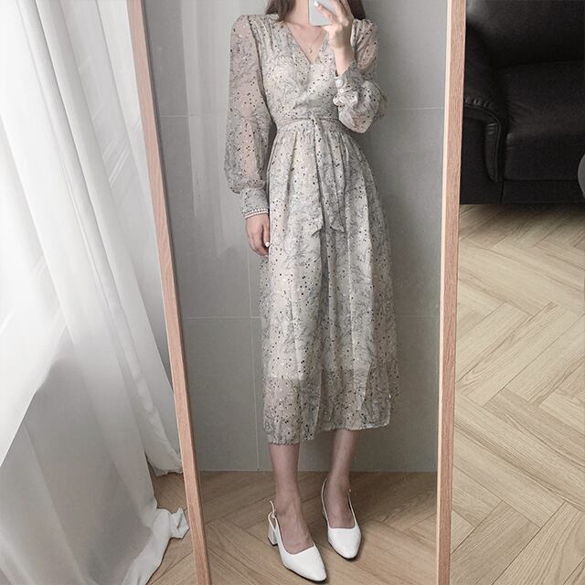 ワンピース レディース ドレス 膝丈 ひざ丈 ミディアム丈 長袖 袖あり Vネック リボン ハイウエスト かわいい 大人可愛い きれいめ 大人 上品 おしゃれ お洒落 こなれ感 キュート エレガント 主役級 存在感 花柄 春 夏 秋 冬 謝恩会 結婚式 二次会 発表会 演奏会 お呼ばれ 10代 20代 30代 デート お出かけ 休日 パーティー イベント 着回し 韓国 韓国系 送料無料 ファッション コーデ スタイル モテ 脚長 トレンド 流行 インスタ映え S M L XL デート 女子会