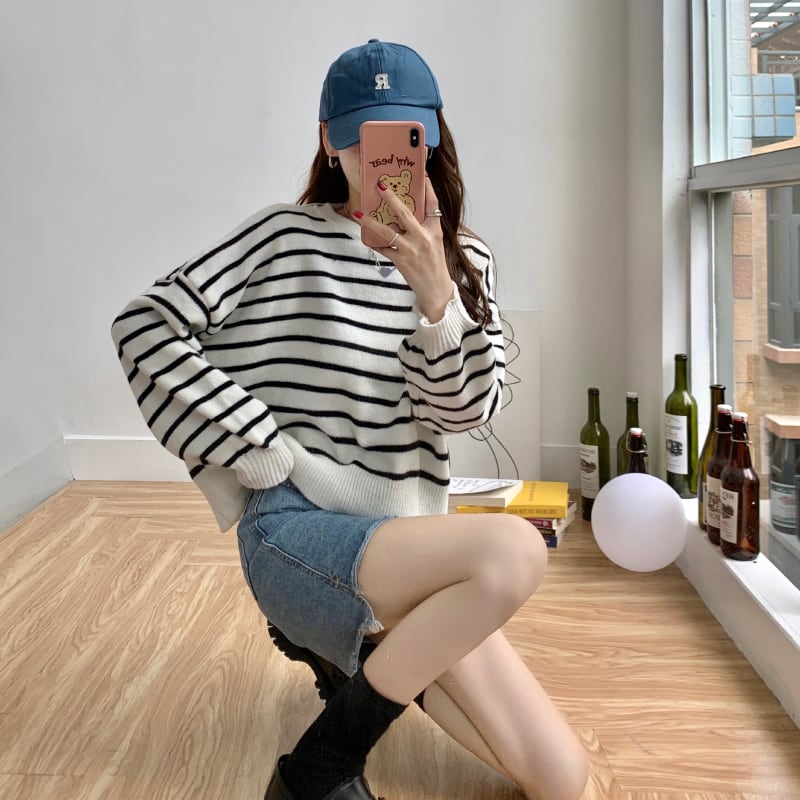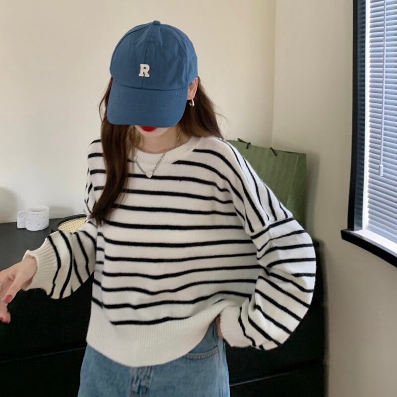 トップス レディース ニット セーター バックボタン 長袖 ラウンドネック かわいい 大人可愛い カジュアル おしゃれ お洒落 かっこいい レトロ こなれ感 ラフ キュート 送料無料 存在感 ボーダー ストライプ 秋 冬 10代 20代 30代 40代 学生 通学 デート お出かけ 女子会 休日 着回し 普段使い 重ね着 韓国 韓国系 ファッション コーデ スタイル モテ トレンド 流行 インスタ映え ゆったり ゆる ワンサイズ フリーサイズ 白 ホワイト ブラウン