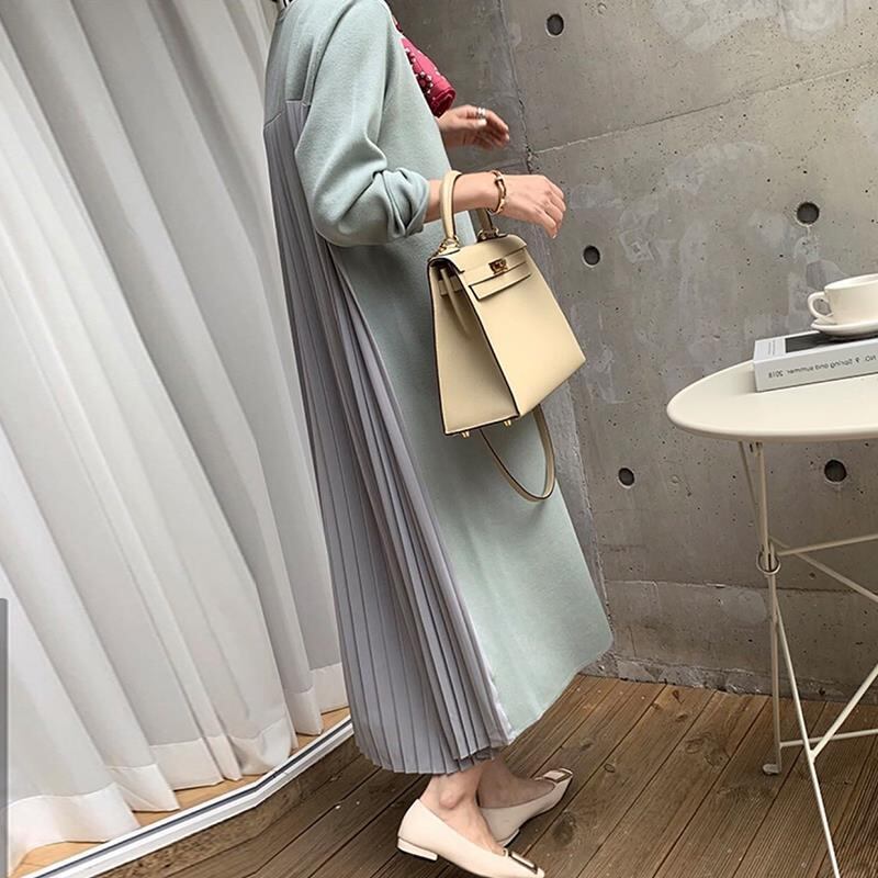 ワンピース レディース ロングワンピース 3カラー フリーサイズ グリーン ブルー イエロー カラバリ 長袖 無地 ロング丈 プリーツ バックコンシャス 異素材ドッキング カットソー プルオーバー ゆったり ルーズ スタイルアップ 体型カバー マタニティ シンプル カジュアル フェミニン エレガント 大人可愛い かわいい おしゃれ 普段使い イベント デート お出かけ 女子会 休日 旅行 着まわし ファッション コーデ スタイル 送料無料 こなれ感 ユニーク 春 秋 冬