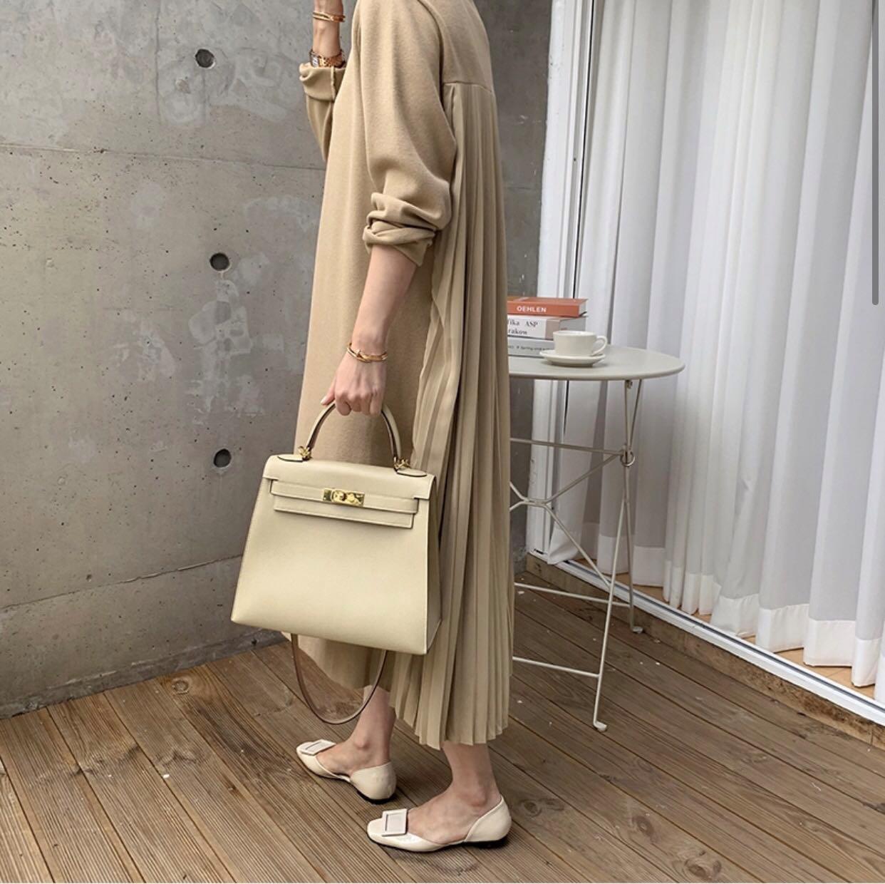 シンプルでありながら、バックスタイルが目をひくプリーツデザインワンピース。