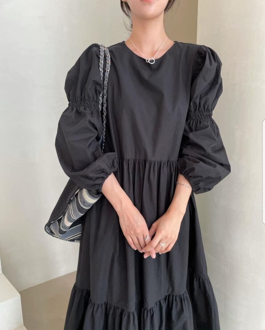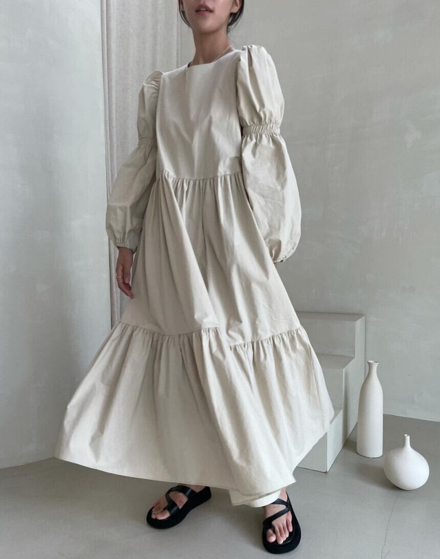 ワンピース レディース ロング ロング丈 マキシ マキシ丈 ティアード 長袖 ラウンドネック ギャザー かわいい 大人可愛い きれいめ カジュアル おしゃれ お洒落 大人女子 こなれ感 ラブリー キュート エレガント 主役級 存在感 無地 春 10代 20代 30代 40代 学生 通学 デート お出かけ 女子会 イベント リゾート 旅行 着回し 普段使い 韓国 韓国系 送料無料 ファッション コーデ スタイル 体型カバー トレンド 流行 ワンサイズ フリーサイズ 黒 ブラック ベージュ