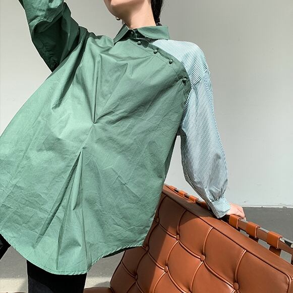 トップス レディース シャツ ブラウス 長袖 襟付き かわいい 大人可愛い きれいめ カジュアル 大人 上品 おしゃれ お洒落 かっこいい 送料無料 ラフ クール エレガント 無地 春 秋 冬 10代 20代 30代 OL 通勤 学生 通学 デート お出かけ 女子会 休日 着回し 普段使い 重ね着 韓国 韓国系 ファッション コーデ スタイル モテ トレンド 流行 デート カフェ巡り インスタ映え S M L XL デザインシャツ アシンメトリー 変形デザイン グリーン ストライプ モード系 シック