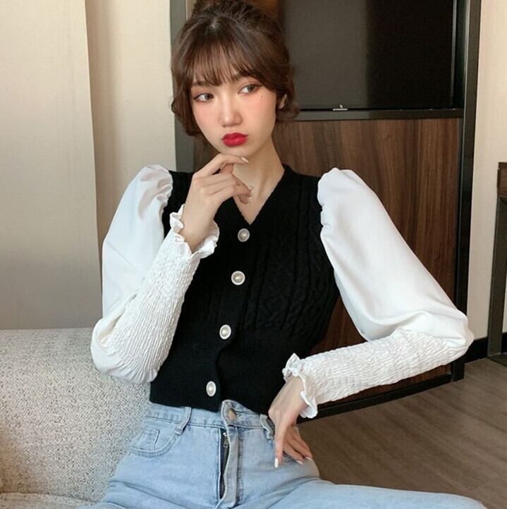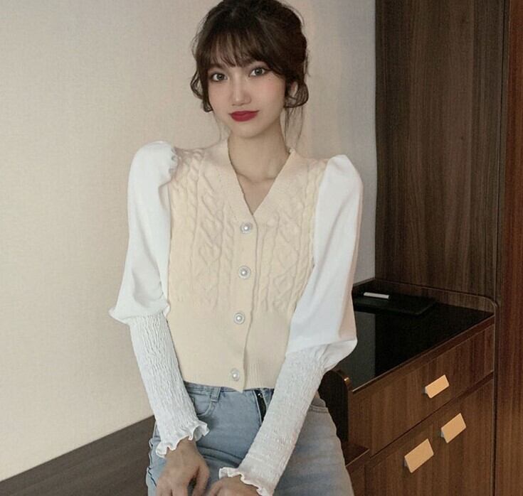 トップス レディース ブラウス ニット ショート ショート丈 長袖 パフスリーブ Vネック かわいい 大人可愛い きれいめ 上品 おしゃれ お洒落 大人女子 こなれ感 ラブリー キュート ガーリー エレガント 主役級 存在感 フェミニン 秋 冬 10代 20代 30代 OL 通勤 学生 通学 デート お出かけ 女子会 着回し 普段使い 韓国 韓国系 送料無料 ファッション コーデ スタイル モテ トレンド 流行 ワンサイズ フリーサイズ 白 ホワイト 黒 ブラック ベージュ カーキ