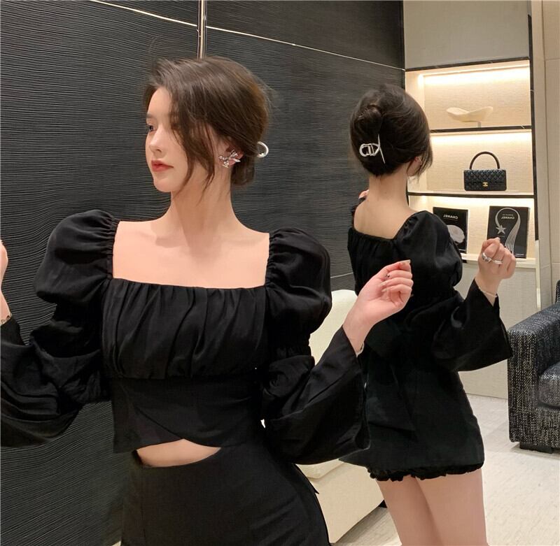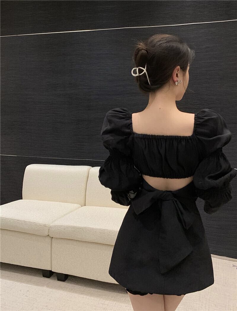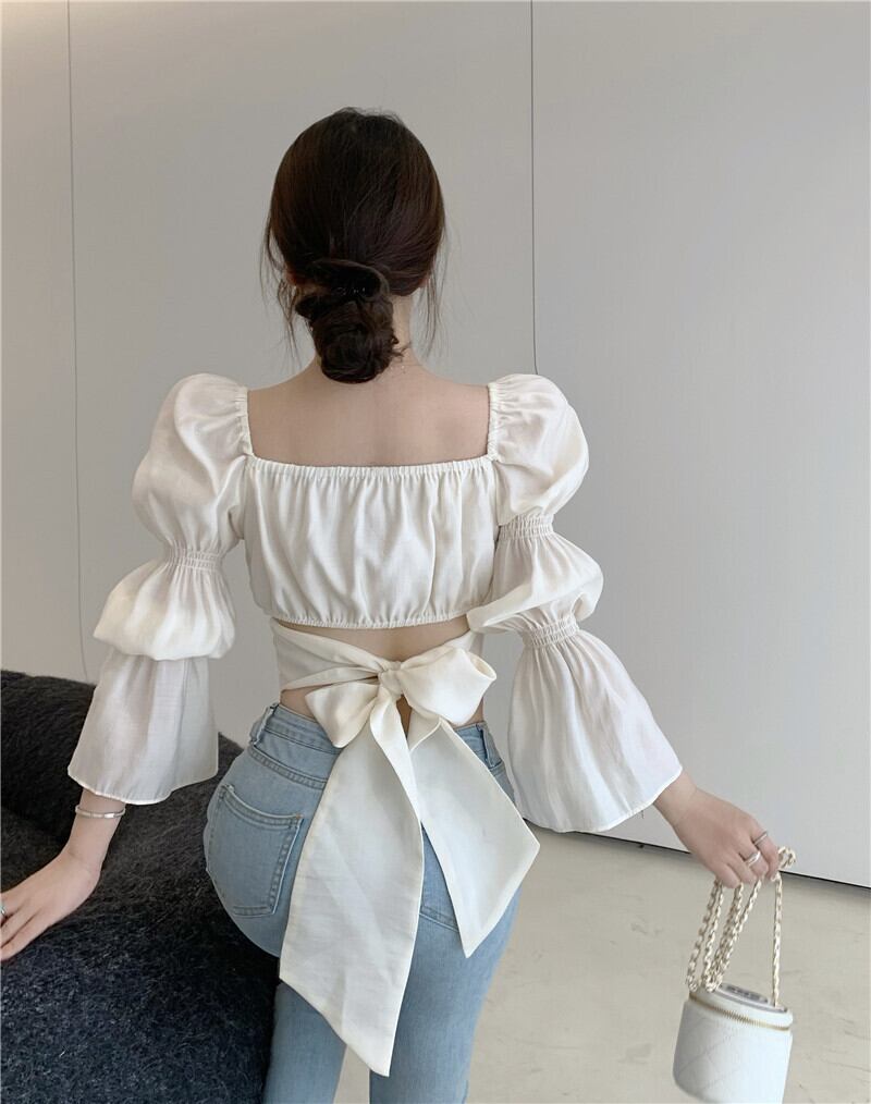 トップス レディース ブラウス ショート ショート丈 長袖 パフスリーブ スクエアネック 肌見せ バックリボン かわいい 大人可愛い きれいめ 上品 おしゃれ お洒落 大人女子 こなれ感 ラブリー キュート ガーリー エレガント 主役級 存在感 フェミニン 秋 冬 10代 20代 30代 OL 通勤 学生 通学 デート お出かけ 女子会 着回し 普段使い 韓国 韓国系 送料無料 ファッション コーデ スタイル モテ トレンド 流行 S M L ホワイト ブラック プチプラ