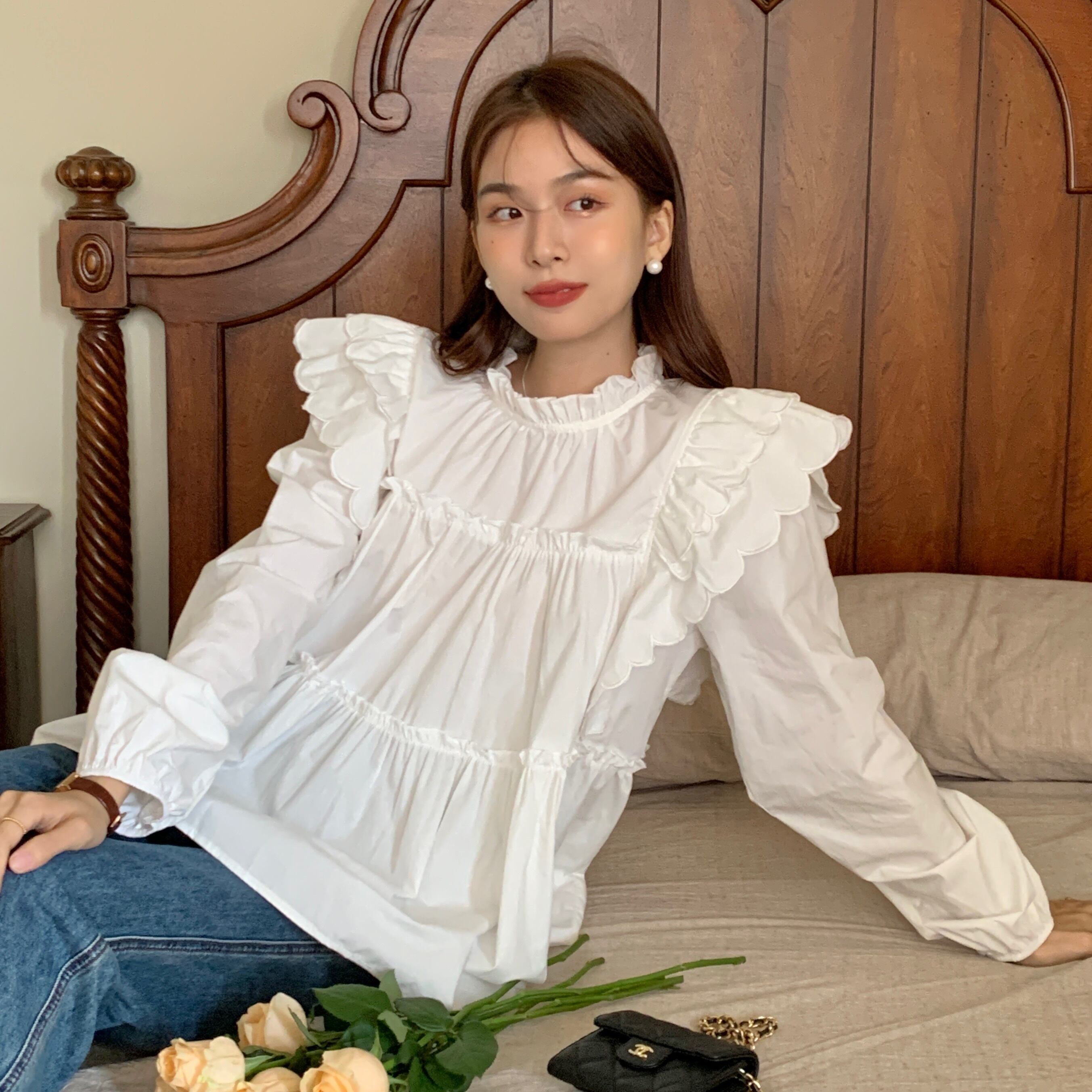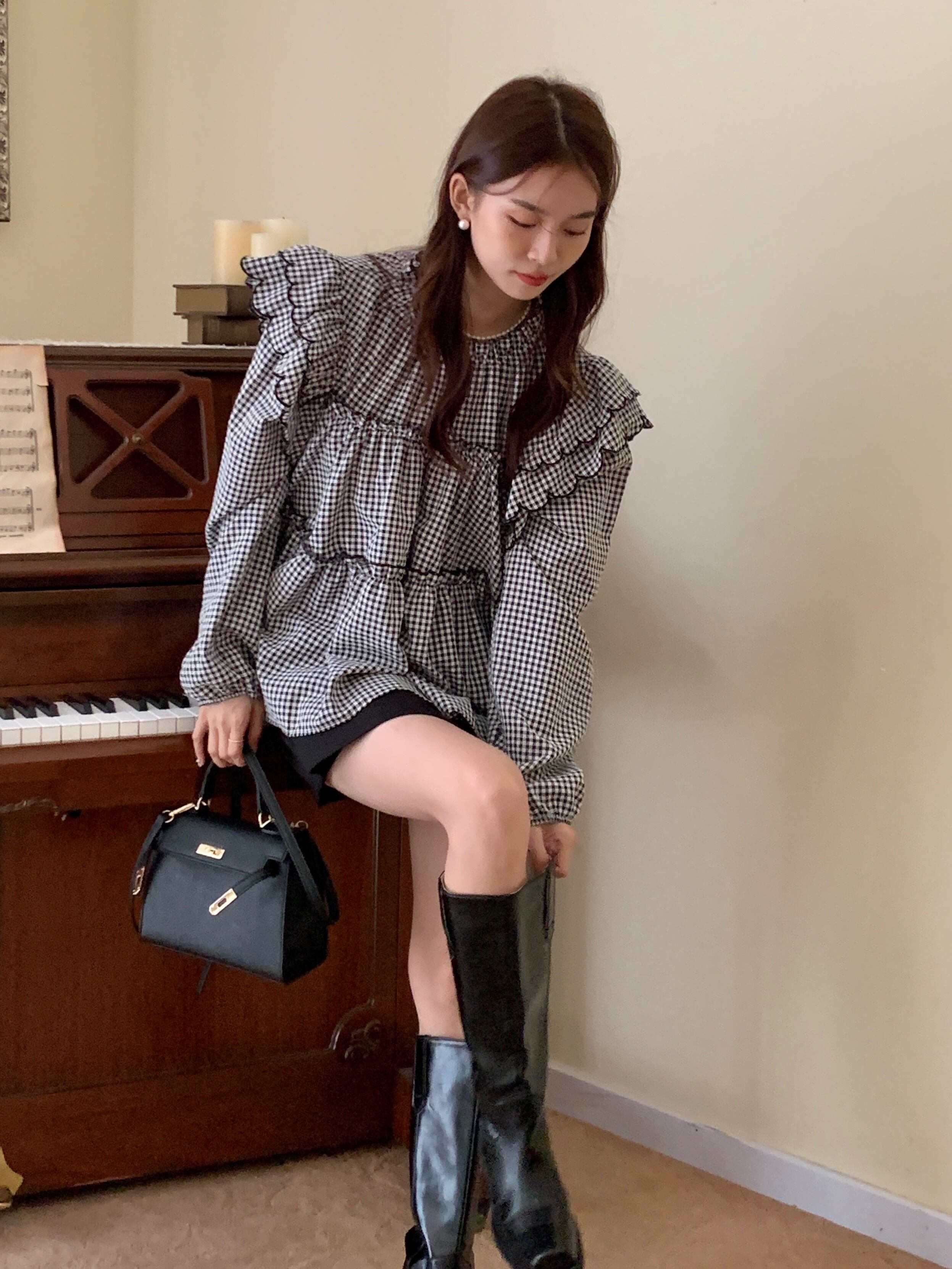 トップス レディース ブラウス 長袖 フリル フレア ティアード かわいい 大人可愛い きれいめ 上品 おしゃれ お洒落 大人女子 こなれ感 ラブリー キュート ガーリー エレガント 主役級 存在感 フェミニン 春 秋 10代 20代 30代 OL 通勤 学生 通学 デート お出かけ 女子会 着回し 普段使い 韓国 韓国系 送料無料 ファッション コーデ スタイル モテ トレンド 流行 S M L ホワイト 白 チェック柄