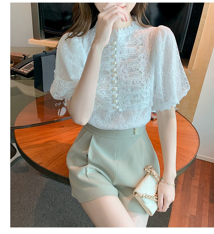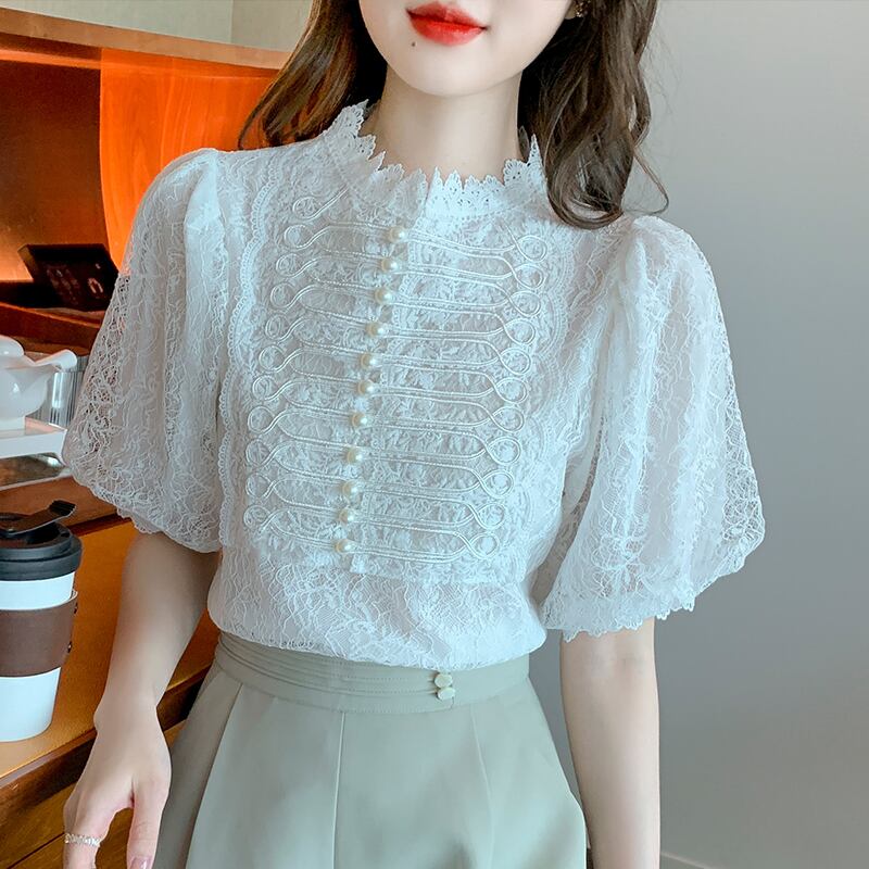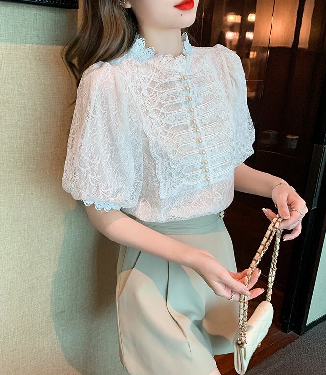 トップス レディース ブラウス シャツ S M L XL 半袖 レース パフスリーブ シフォン パール ナポレオン かわいい ハイネック 大人可愛い きれいめ カジュアル 大人 上品 おしゃれ お洒落 かっこいい フェミニン 送料無料 クール キュート 無地 春 夏 秋 10代 20代 30代 40代 50代 オフィス ビジネス OL 通勤 学生 通学 デート お出かけ 女子会 休日 着回し 普段使い 重ね着 韓国 韓国系 ファッション コーデ スタイル モテ 体型カバー トレンド 流行 インスタ