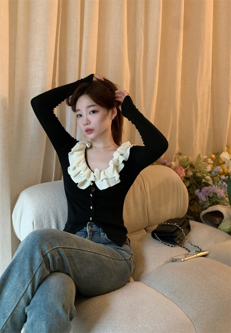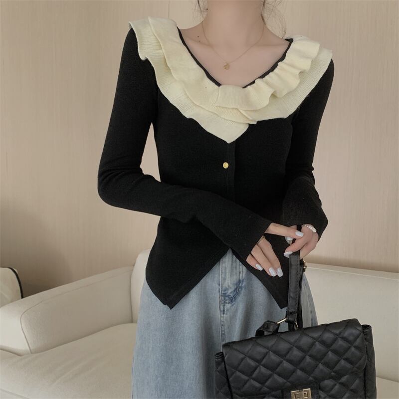 トップス レディース ニット セーター カーディガン 長袖 フリル かわいい 大人可愛い きれいめ おしゃれ お洒落 こなれ感 ラブリー キュート ガーリー セクシー エレガント 主役級 存在感 フェミニン 無地 春 秋 10代 20代 30代 学生 通学 デート お出かけ 女子会 休日 着回し 普段使い 韓国 韓国系 送料無料 ファッション コーデ スタイル モテ トレンド 流行 インスタ映え ワンサイズ フリーサイズ 黒 ブラック