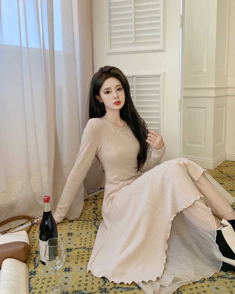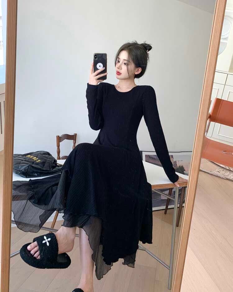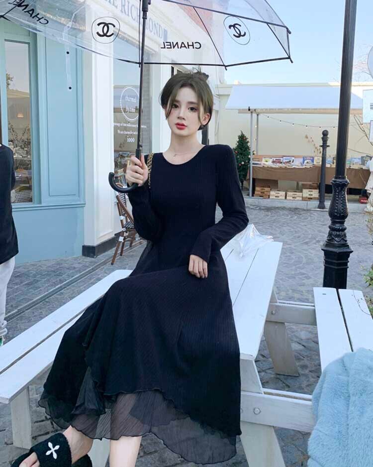 ワンピース レディース フレアワンピース ロングスカート ロング丈 長袖 ラウンドネック Aライン フレア レース ドッキング 透け感 かわいい 大人可愛い きれいめ シンプル カジュアル 大人 上品 おしゃれ 大人女子 ガーリー 個性的 クール 送料無料 とろみ感 S M L XL 2XL ブラック アプリコット 無地 春 秋 冬 10代 20代 30代 ママ OL 通勤 学生 通学 デート お出かけ 女子会 着回し 普段使い 韓国系 ファッション コーデ スタイル 楽ちん モテ トレンド 流行