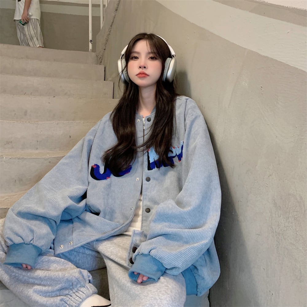 アウター レディース ブルゾン ジャケット ジャンパー 長袖 コーデュロイ かわいい 大人可愛い カジュアル おしゃれ お洒落 かっこいい レトロ こなれ感 ラフ メンズライク ボーイッシュ ルーズ 主役級 存在感 ストリート ロゴ 10代 20代 学生 通学 デート お出かけ 女子会 休日 アウトドア 着回し 普段使い 重ね着 韓国 韓国系 送料無料 ファッション コーデ スタイル 体型カバー トレンド 流行 インスタ映え M L XL ブルー グレー ゆったり ゆる オーバーサイズ