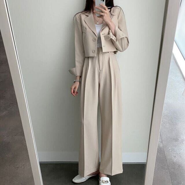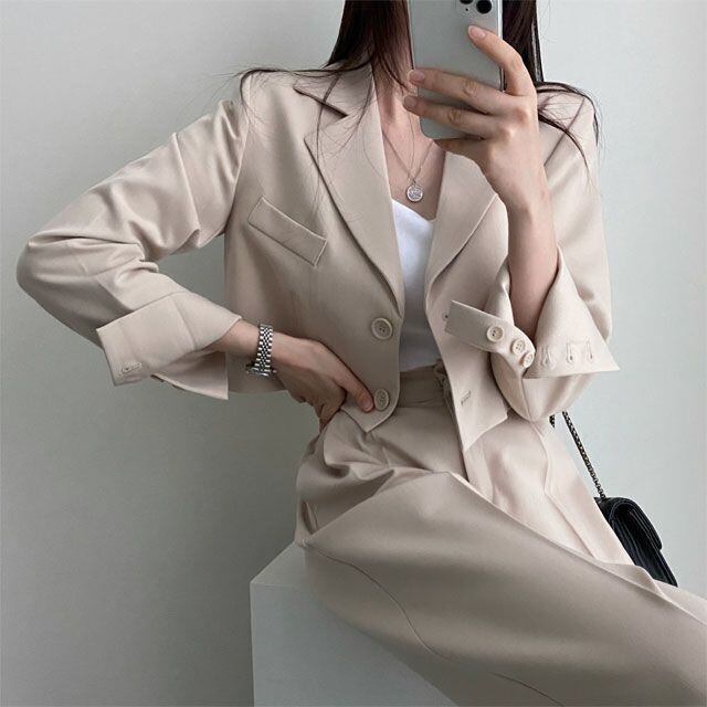 ショート丈のジャケットで今っぽく、ハイウエストのワイドパンツでカッコよくシンプルだからいろんな着こなしができる大人カッコいいセットアップ♪